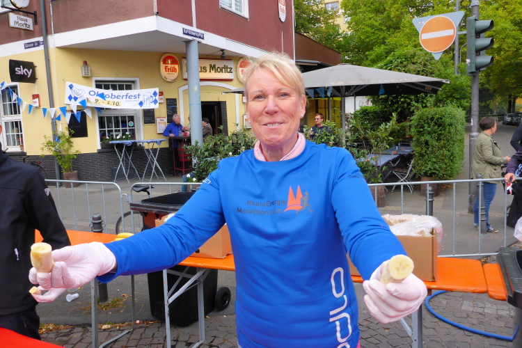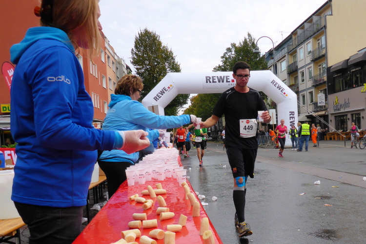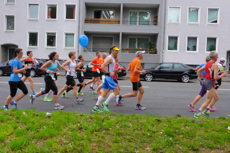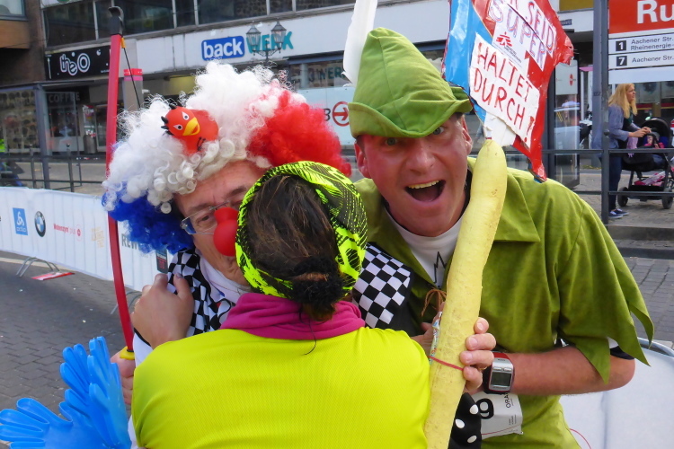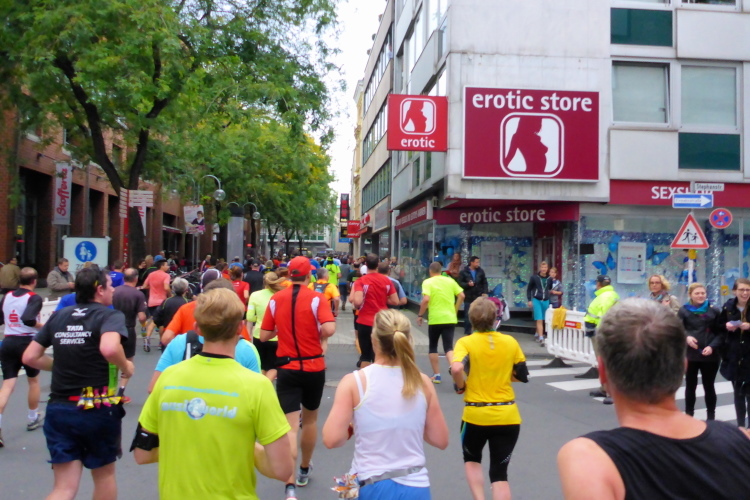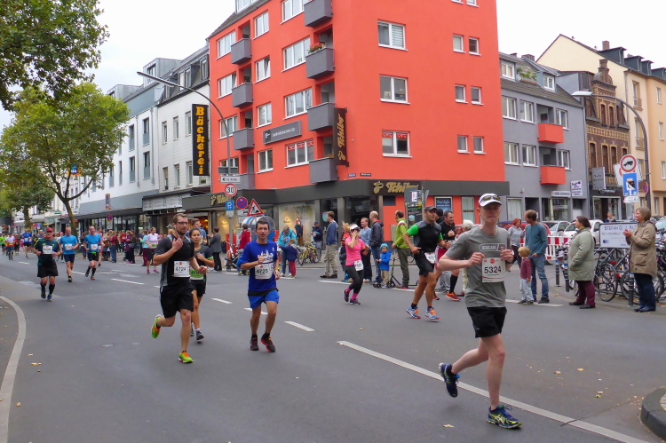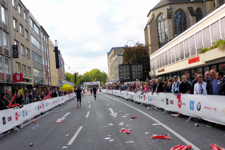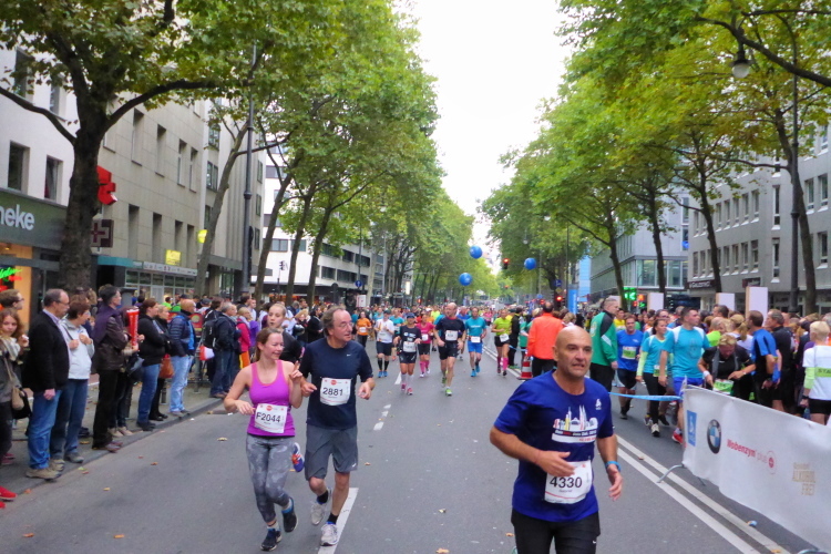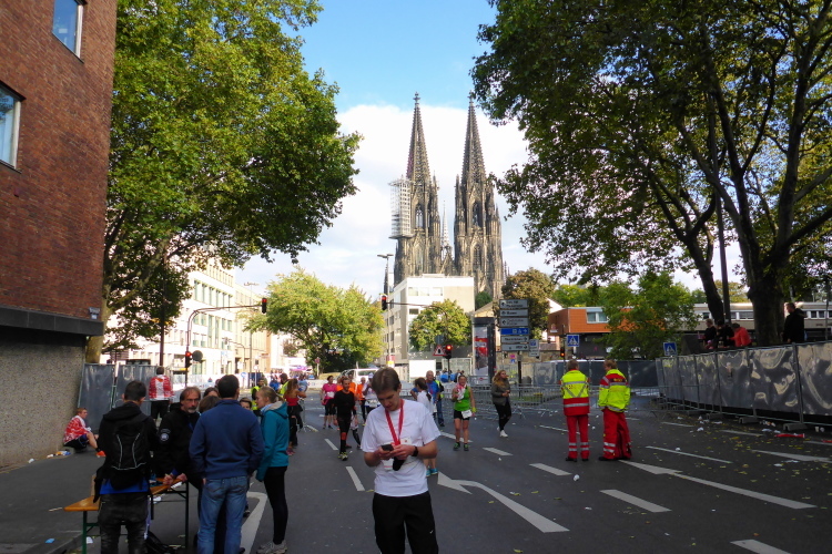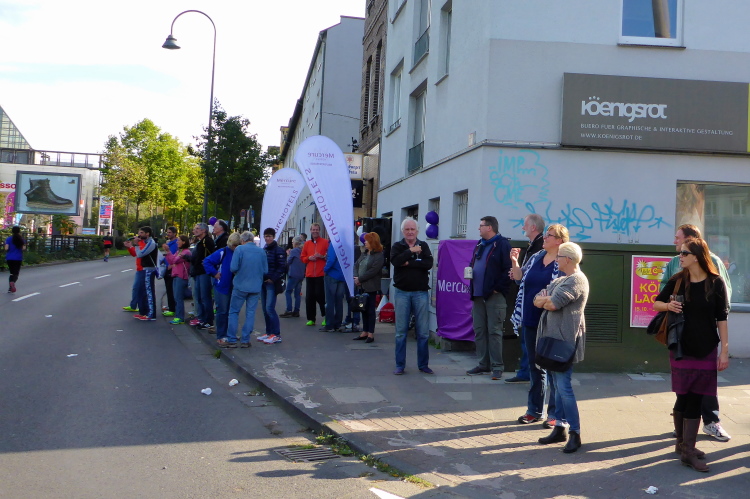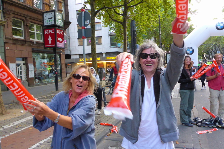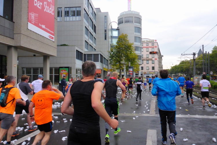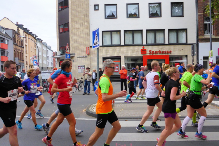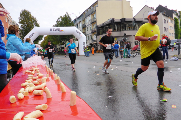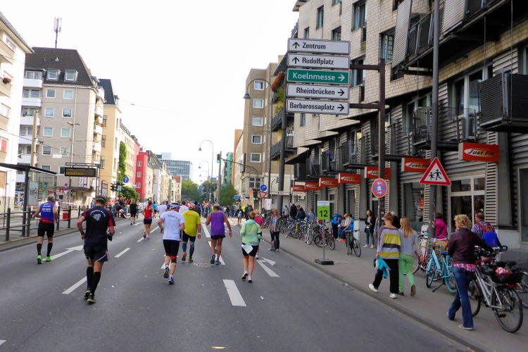Die Sonne hat sich durchgekämpft und bringt uns auch zum Schmelzen. Anwohner bringen auch was, und zwar ihren gesamten Hausstand und wollen den am Strassenrand verkaufen. Köln ist so bekloppt, die legen sogar Bananen aus und denken, dann kommen die Läufer!