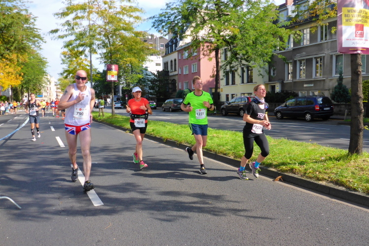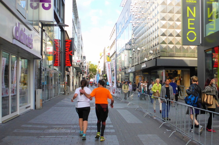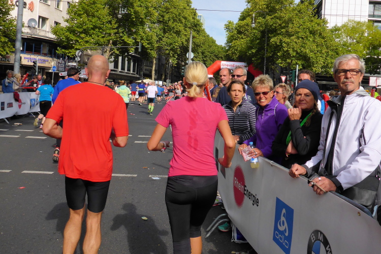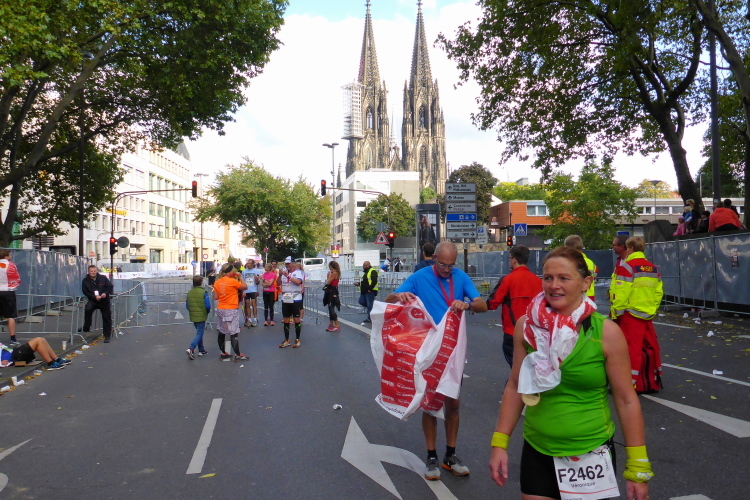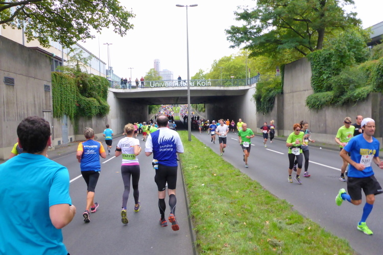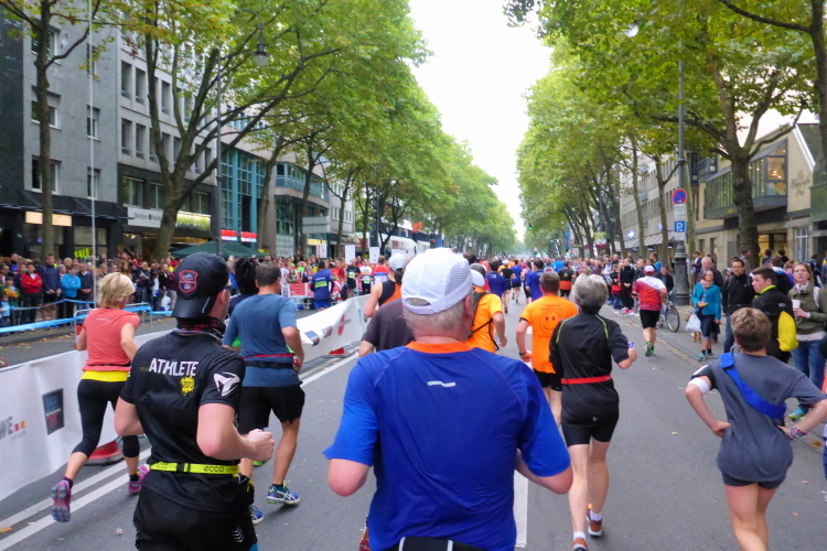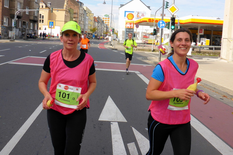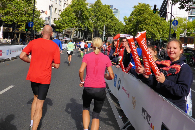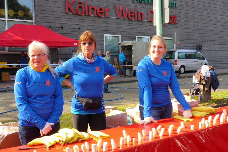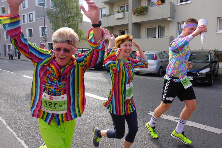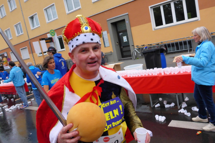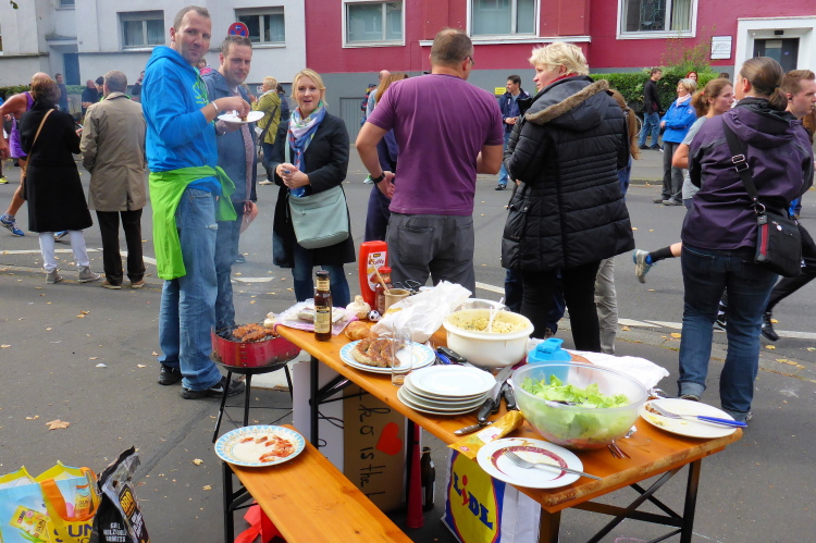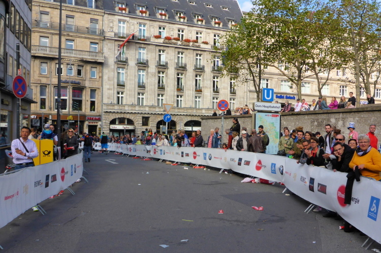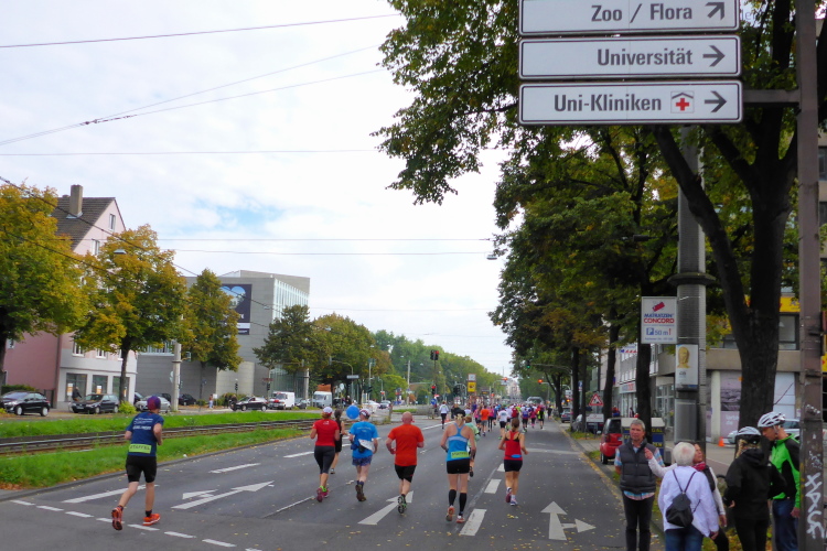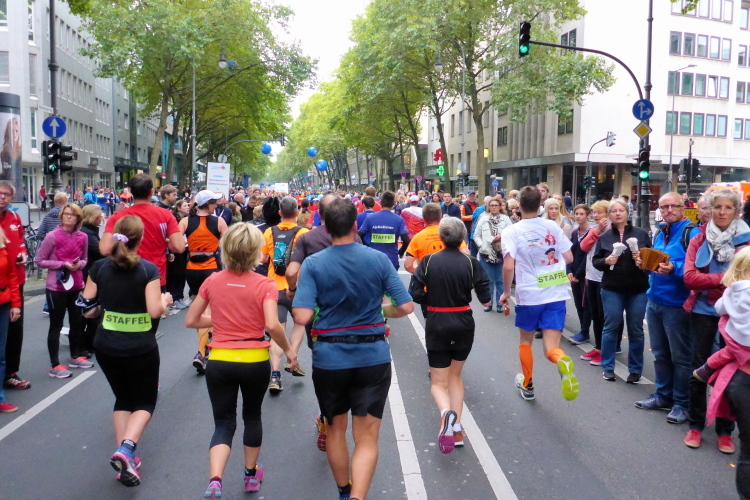 Die Sonne hat sich durchgekämpft und bringt uns auch zum Schmelzen. Anwohner bringen auch was, und zwar ihren gesamten Hausstand und wollen den am Strassenrand verkaufen. Köln ist so bekloppt, die legen sogar Bananen aus und denken, dann kommen die Läufer!