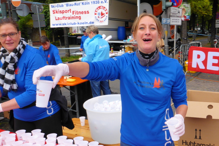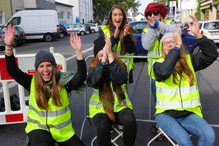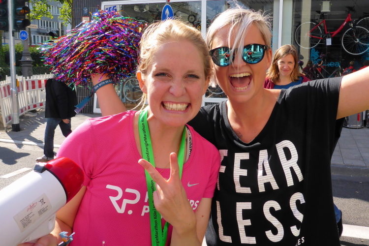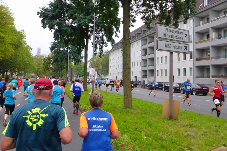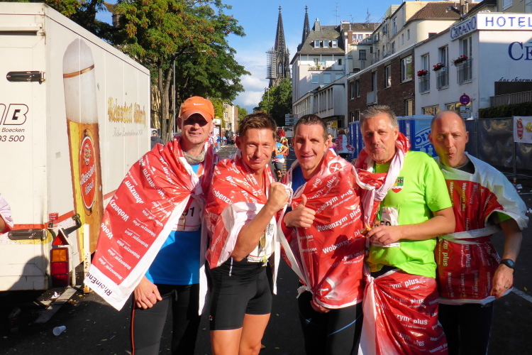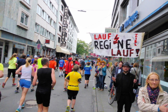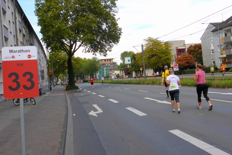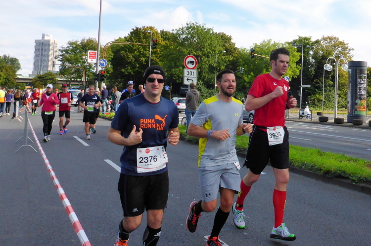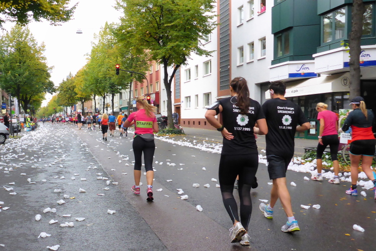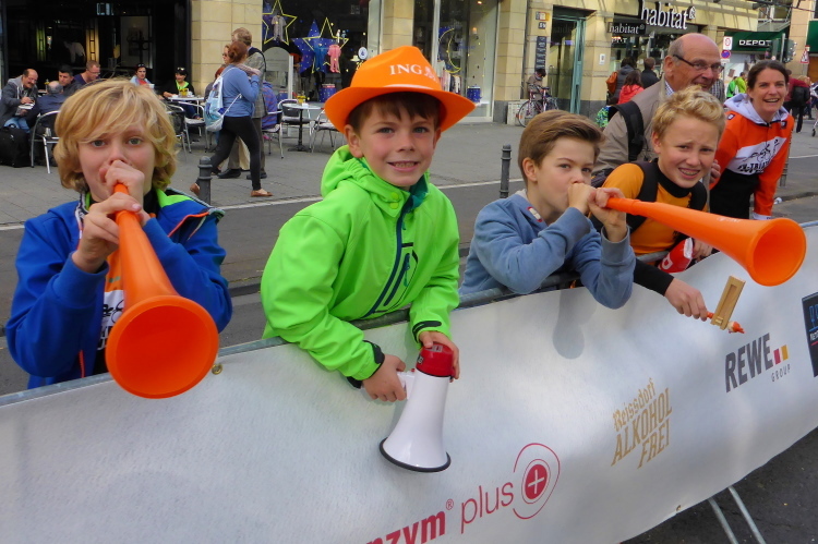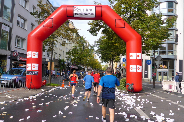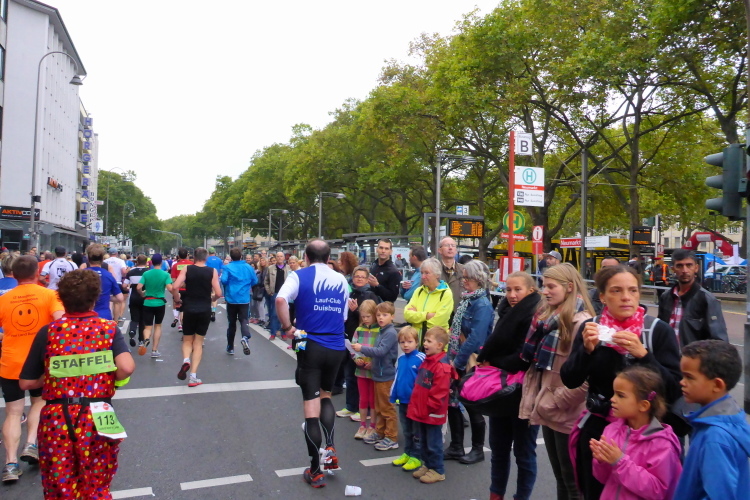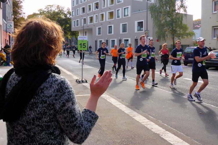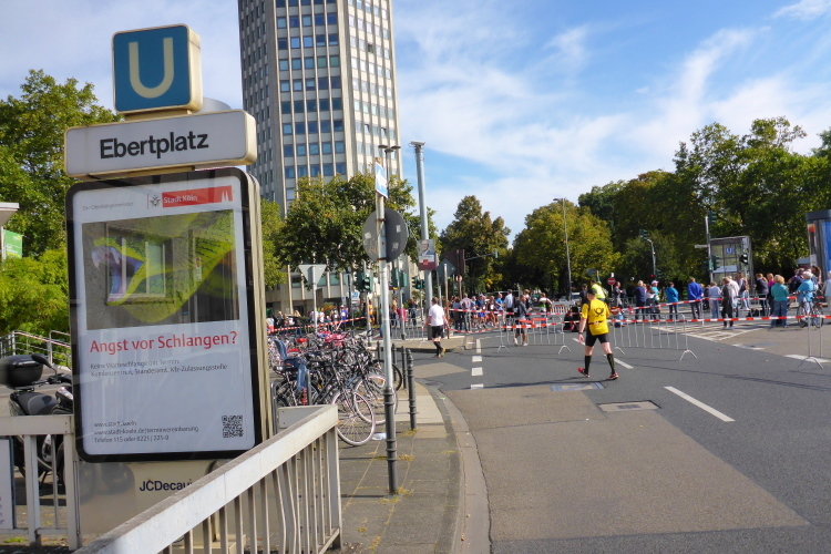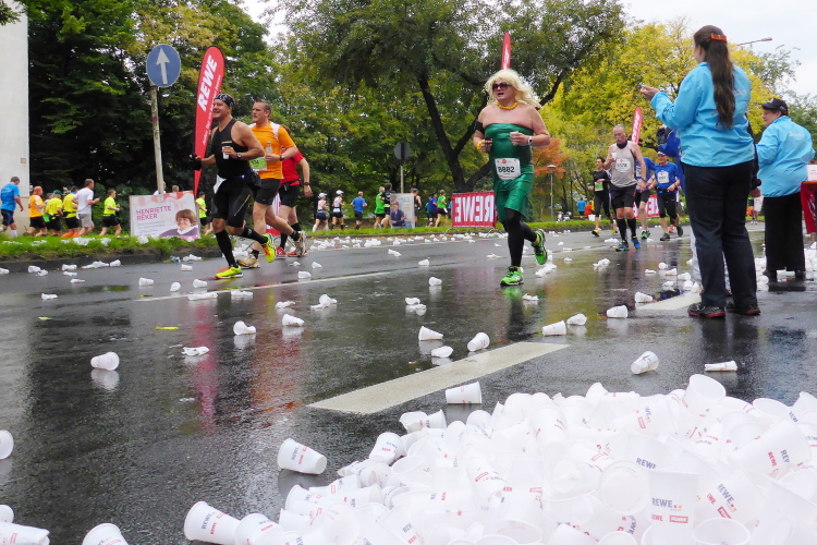 Die Sonne hat sich durchgekämpft und bringt uns auch zum Schmelzen. Anwohner bringen auch was, und zwar ihren gesamten Hausstand und wollen den am Strassenrand verkaufen. Köln ist so bekloppt, die legen sogar Bananen aus und denken, dann kommen die Läufer!