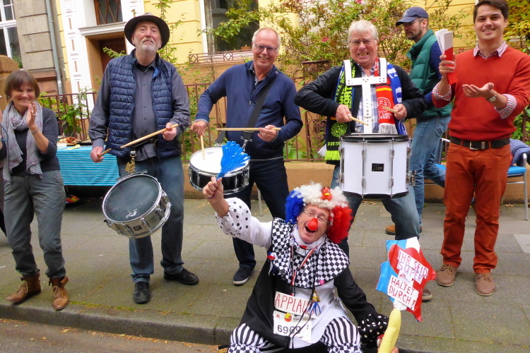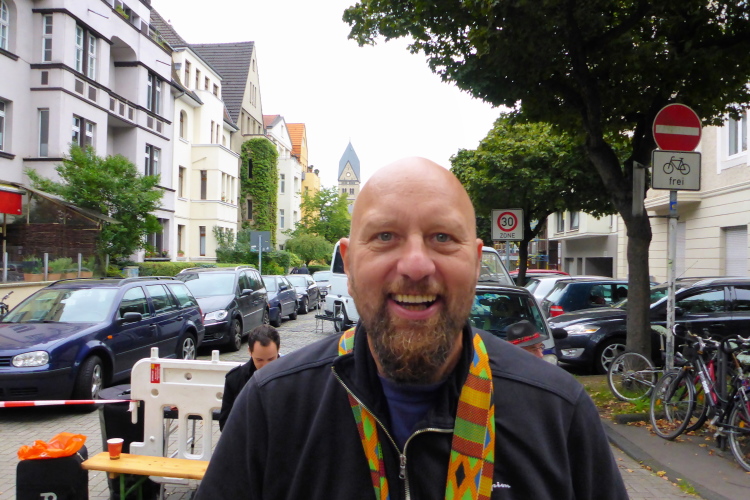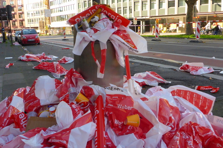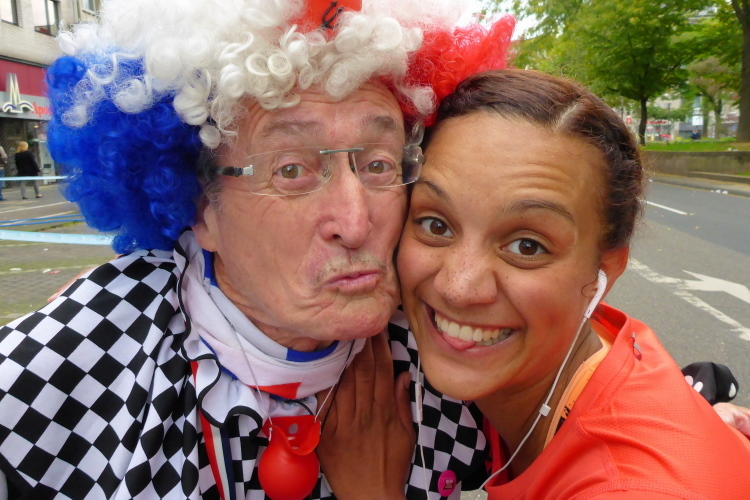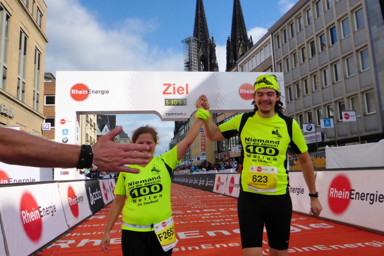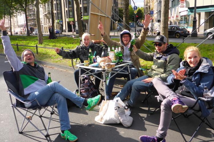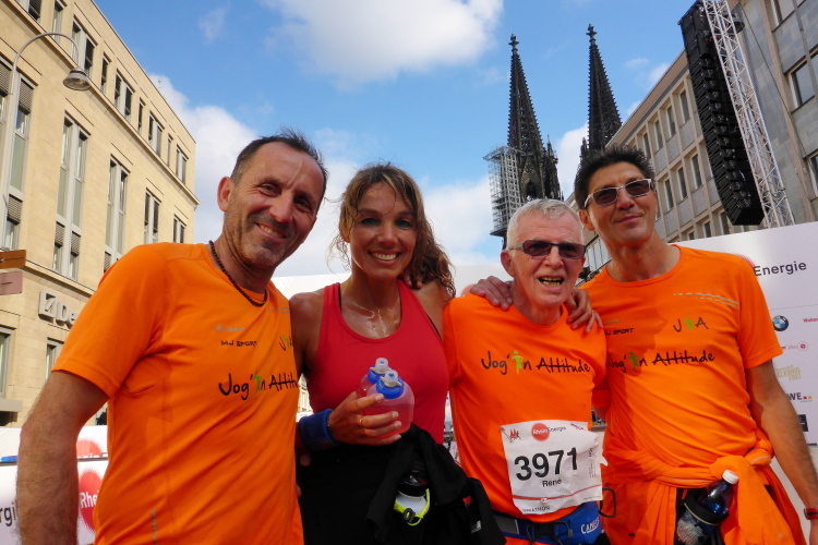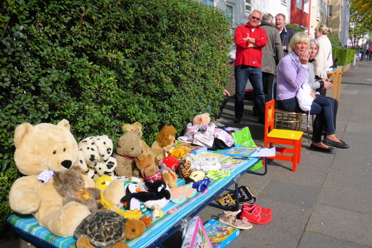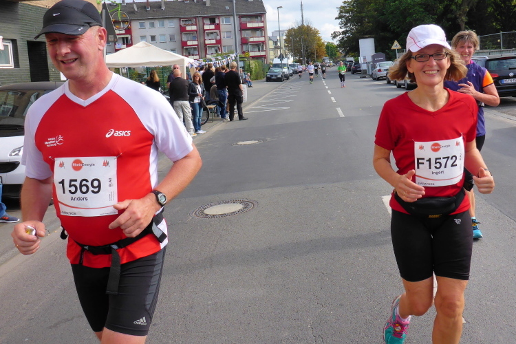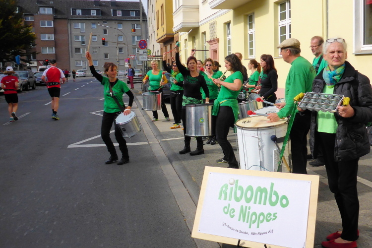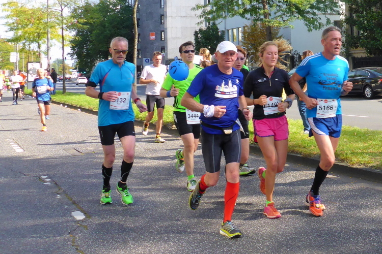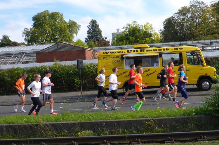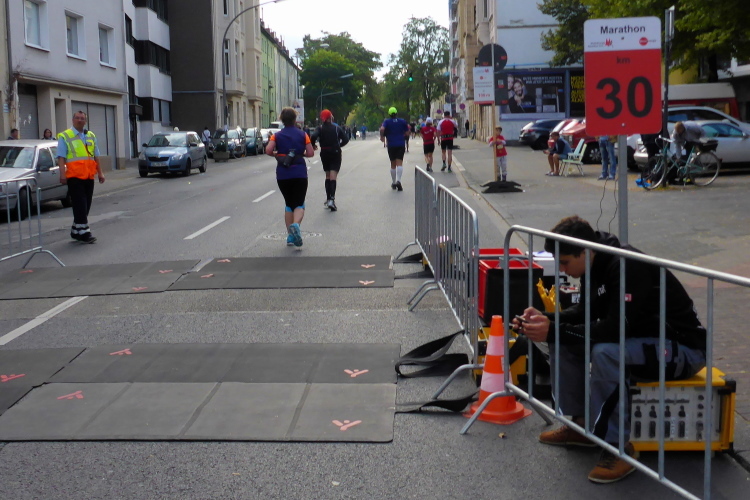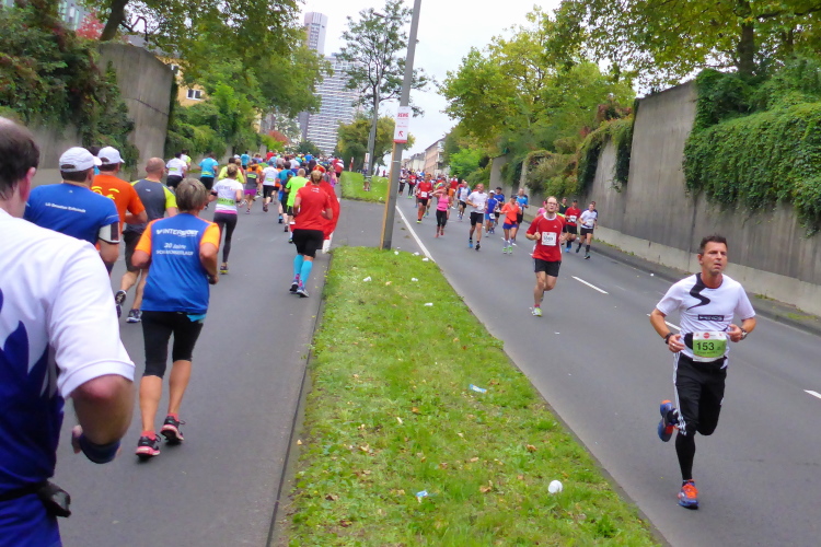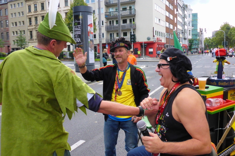 Die Sonne hat sich durchgekämpft und bringt uns auch zum Schmelzen. Anwohner bringen auch was, und zwar ihren gesamten Hausstand und wollen den am Strassenrand verkaufen. Köln ist so bekloppt, die legen sogar Bananen aus und denken, dann kommen die Läufer!