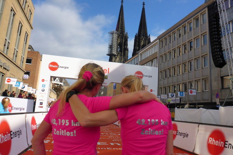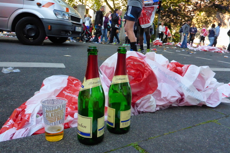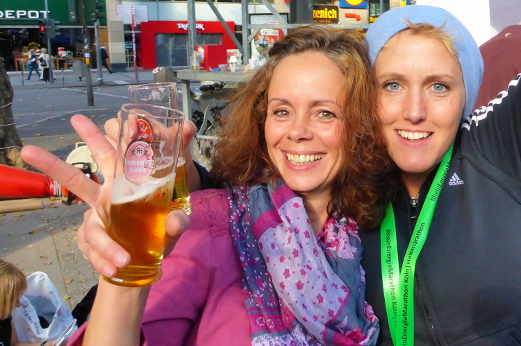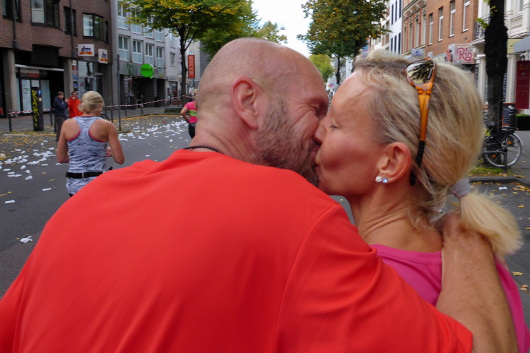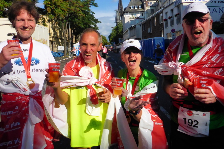 Spektakulär ist dann allerdings die Zielverpflegung. Hier zeigt der Köln Marathon absolut weltmeisterliches Niveau! Super Klasse! „Reissdorf“ ist einfach geradeaus! Die Kölschbrauerei spendiert uns den Partybereich. Hier wird getanzt und naja….in Köln ist eben nichts normal. Wie bekommt man eigentlich kussechten Lippenstift wieder ab?