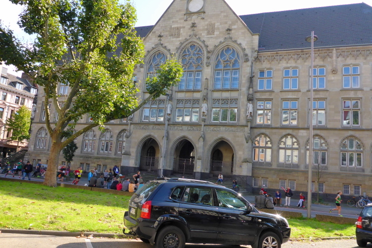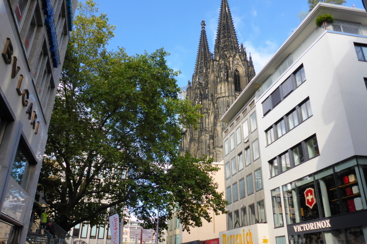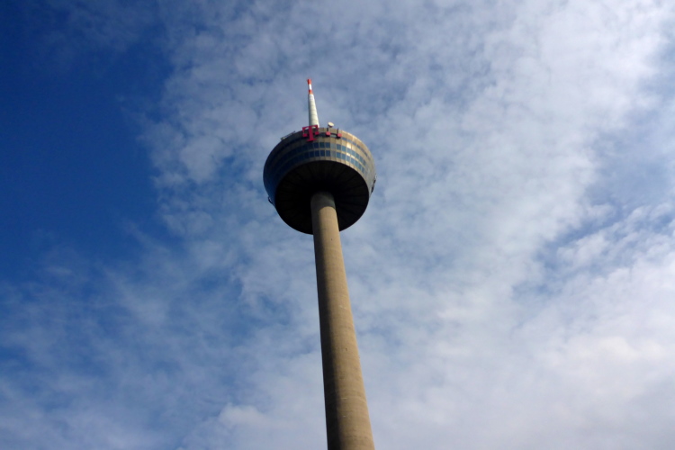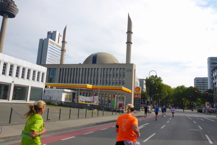 Rudolfplatz zum Zweiten, Hohenzollernring, Friesenplatz und Tempo! Der Fernsehturm, und in Sichtweite die riesige Kölner Moschee. Da sind die Türme von St Gereon nicht mehr sichtbar. Der Stadtheilige Gereon war ein römischer Offizier, der sich mit seinen Soldaten zum Christentum bekannte. Alle wurden geköpft und hier in einen Brunnen geworfen. Dieser Stadtteil hiess früher „ad martyres“, daraus wurde Ehrenfeld. Helena, die Mutter des Kaisers Konstantin, liess über dem Brunnen die Gereonskirche bauen, in deren Inneren steht eine Säule, die Blut ausschwitzt.