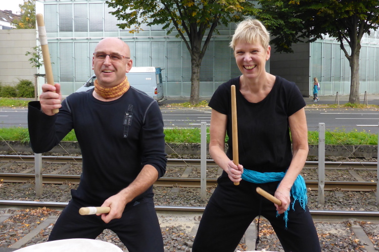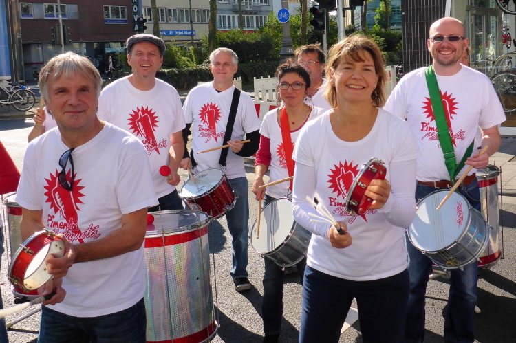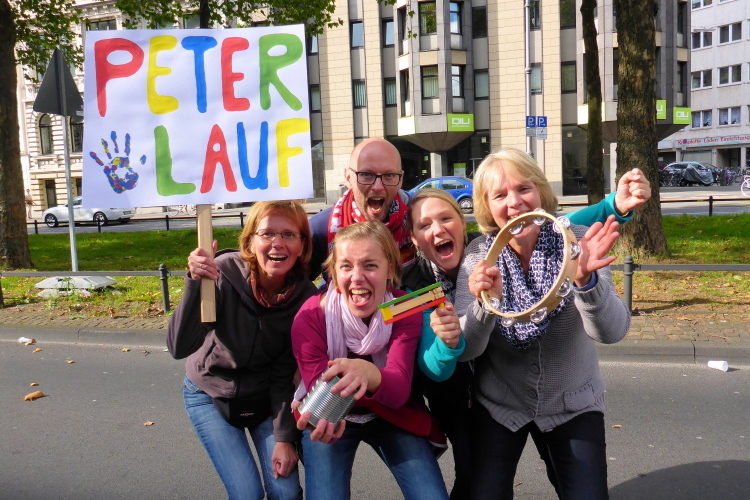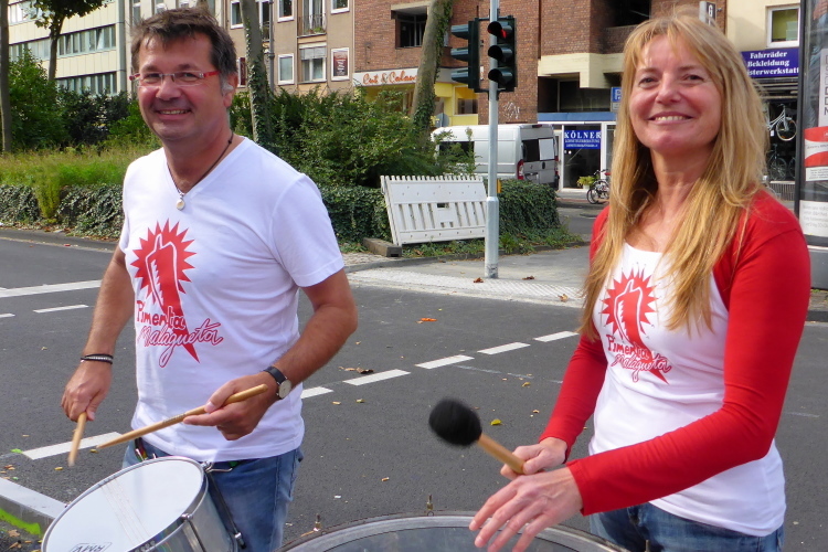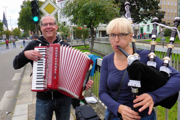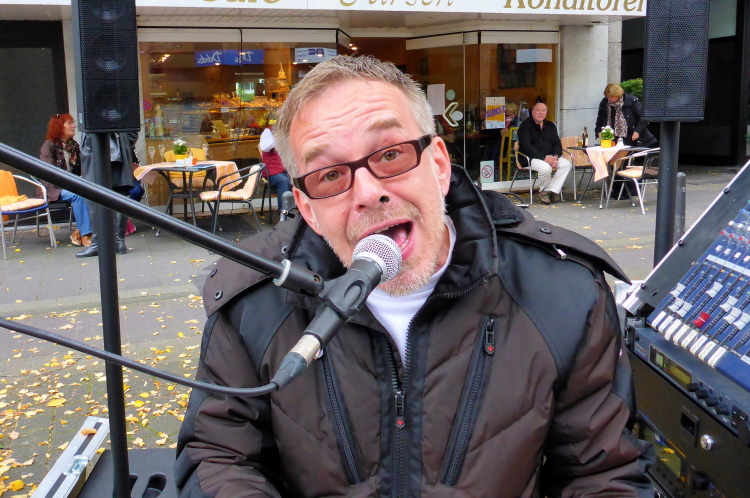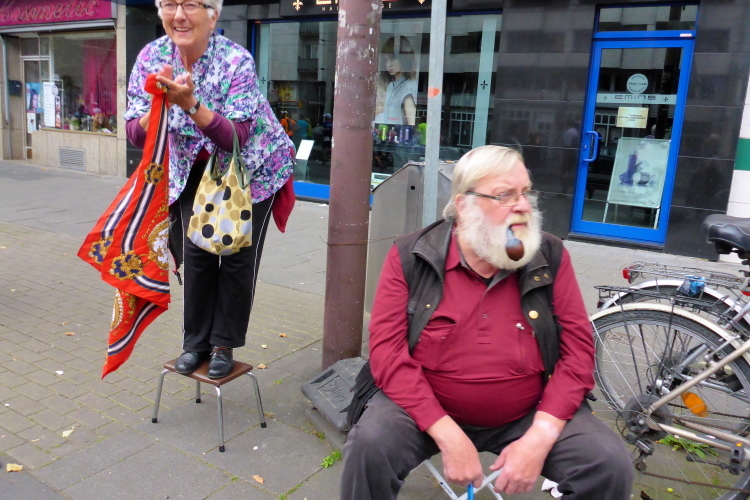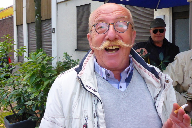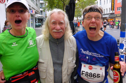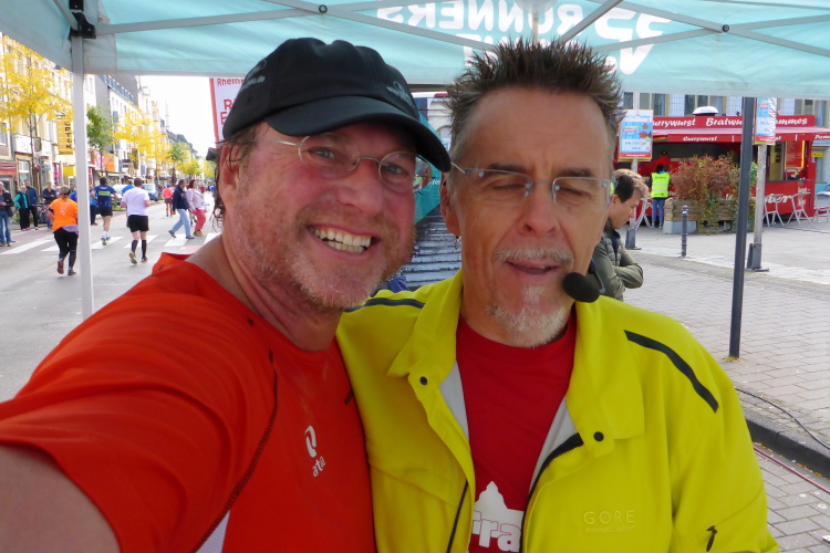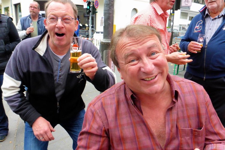 Km 14,5: Das Highlight des Köln Marathons: Hans Süper! Sein Name ist unbekannt, der Name „Colonia Duett“ auch. Doch alle kennen den Kleinen mit der Mandoline („Flitsch“) und seinen ernsten Kollegen Hans „Zimmermääään“ mit der popligen Gitarre, „Wiso datt dann?“ Von 1974 bis 1990 traten er und Zimmermääään regelmäßig auf. Bis zu 300 Auftritte pro Jahr, und ich habe jedesmal Tränen gelacht. Die Bezeichnung Zimmermanns als „Ei“ bezog sich auf dessen kahler werdenden Kopf. Hans hat immer noch Geistesblitze mit feinsten Wort- und Situationswitzen, als Kölner bestellt er gleich ne Runde Getränke.