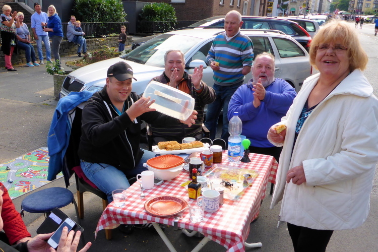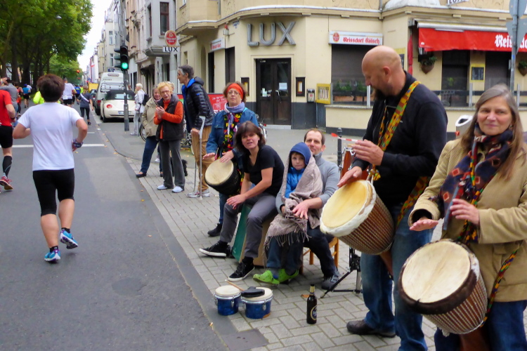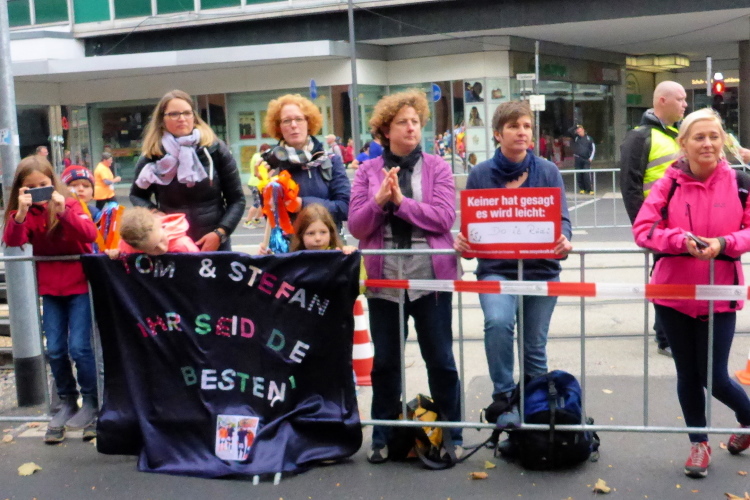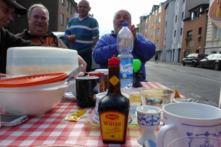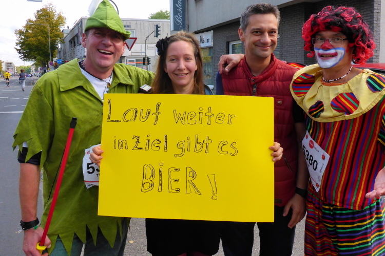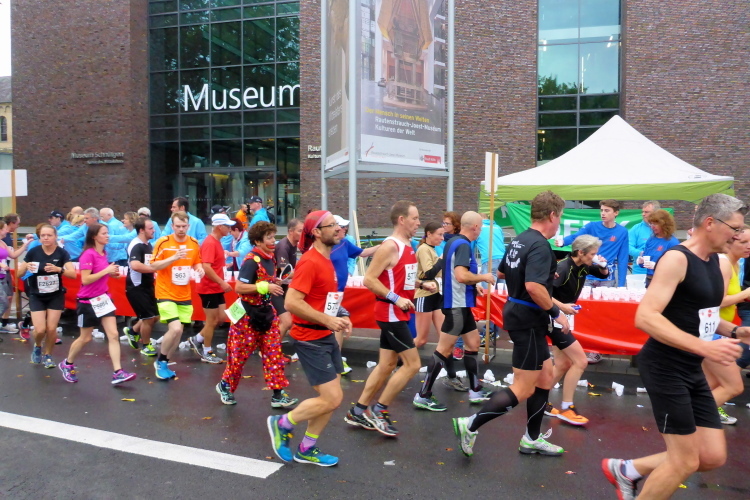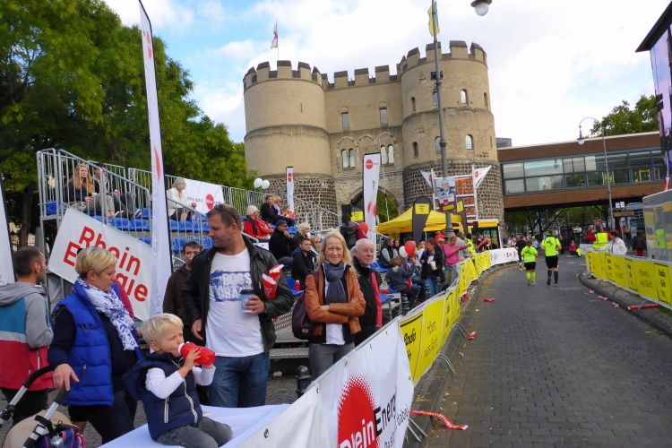 Je weiter ich komme, desto lustiger werden die Zuschauer. Manche haben ihr Wohnzimmer an die Strecke geschafft, andere beschränken sich aufs Wesentliche: Das Fass Kölsch. Oft sitzen überernährte Biertrinker in tiefen Sesseln, ich bin dann der Vermittler zwischen deren und der Läuferwelt. Unerklärlich finde ich, dass neben dem angenagten Frühstücksei eine Flasche Maggi steht. Also probiere ich auch die Kräutersoße und bin begeistert, da sind nämlich jede Menge Elektrolyte drin.