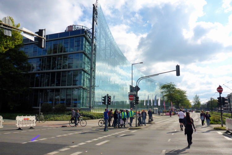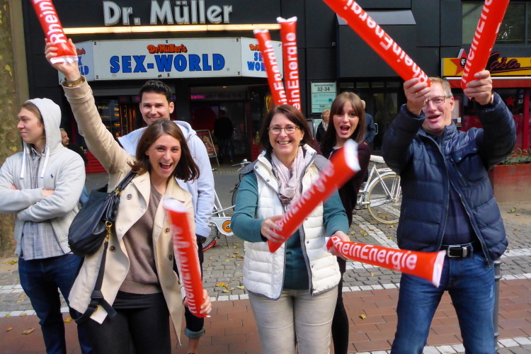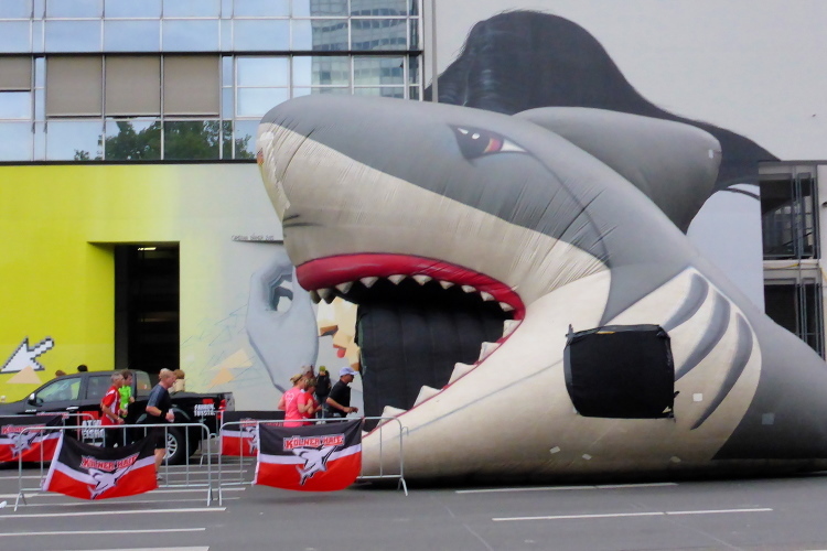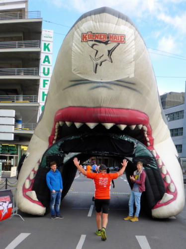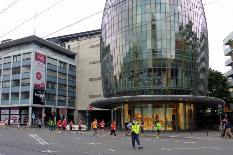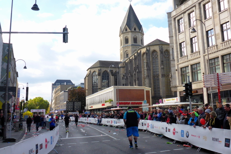 Die Gereonsmühle ist ein Rest der alten Stadtmauer, dahinter ist der Klingepütz, das Gelände des früheren Gefängnisses. Und wieder der infostand-süd.de. Ich bin nicht zum Spass hier, Thorsten und Rolf sind seit einiger Zeit bei mir, weil Pumuckl, wie schon gesagt, irgendwo auf dem Besenwagen rumturnt. Schnell weiter, sonst kommt mein Bericht erst am Donnerstag an die Öffentlichkeit. Zum dritten Mal geht es über den Rudolfplatz, schnell durch das Haifischtor der Kölner Haie, und ab in die Hohe Strasse. Der Zieleinlauf ist um diese Zeit unspektakulär. Aber der Weg ist das Ziel, ich hätte mir gerne sogar noch mehr Zeit genommen.