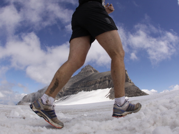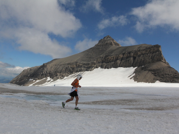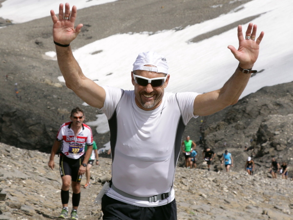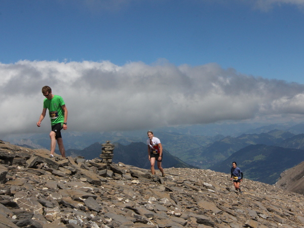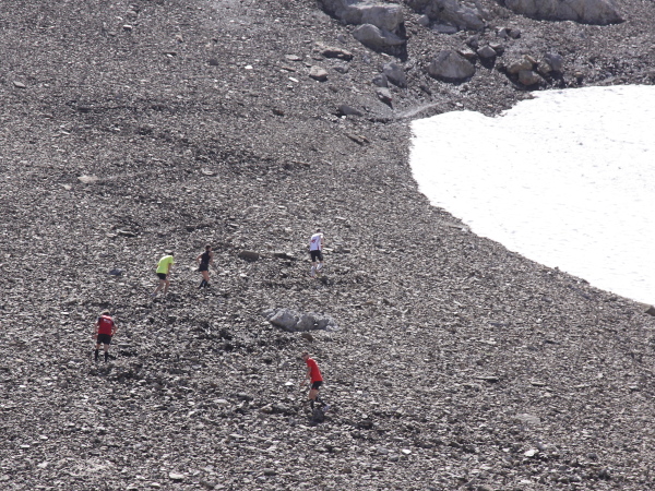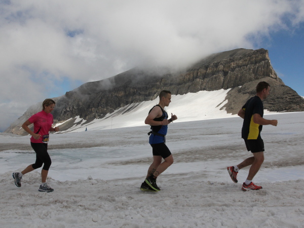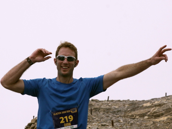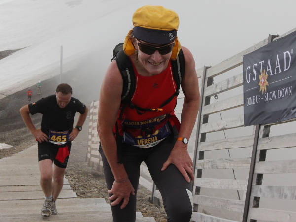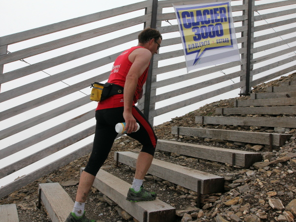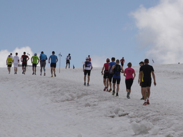 Dann kam der Gletscher, der aber irgendwie recht „sulzig“ war, der Schnee schmolz unter der Sonne und machte das Gelände nicht gerade trittfest. Aber dieser Teil ist kurz und relativ flach, kann also gelaufen werden. Danach läuft man noch einige hundert Meter auf der Moräne, nun die Schlusstreppe und das Ziel vor Augen. Nebelschwaden stiegen über den Kamm und hüllten meine Vorläufer ein. Bald war’s geschafft! Die letzten Treppenstufen und voilà, der Speaker rief meinen Namen, was ich gerade noch mitkriegte, weil ich rechtzeitig den iPod deaktivierte.