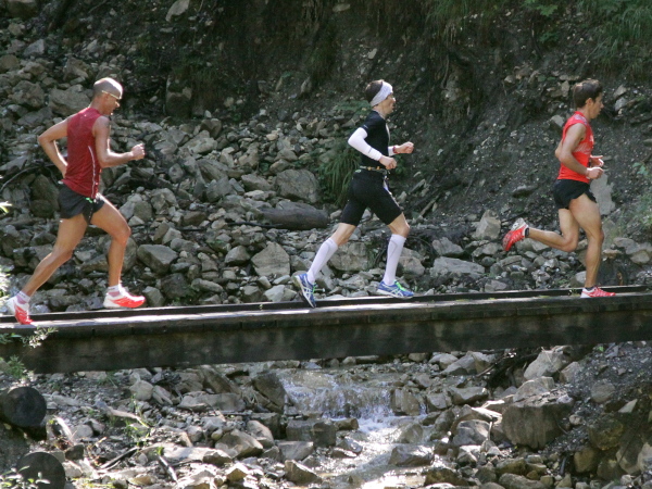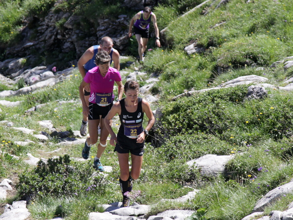 Nach der Wechselzone ging es dann wirklich los. Ich kann von mir nicht behaupten, eine Spezialistin im steilen Gelände zu sein, daher ist vielleicht mein Urteil auch nicht unbedingt in jedem Fall massgeblich. Obwohl ich sonst steile Strecken nicht sonderlich mag, faszinierte mich die Schönheit und Einmaligkeit dieses Streckenabschnitts. Bis ca. km 19,5 konnte man durchaus noch nebeneinander gehen, danach liessen die schmalen und felsigen Pfade kein Nebeneinander mehr zu. Überholen (oder überholt werden) war von da an auch ein grösserer Kraftakt und erforderte einiges Klettergeschick. Im Hinblick auf die noch zurückzulegende Distanz, die bevorstehenden Höhenmeter und die Verletzungsgefahr ist daher von kräfteraubenden Überholmanövern abzuraten. Ausserdem waren die Läufer/innen sehr rücksichtsvoll und gingen oft zur Seite, wenn sie merkten, dass schnellere passieren wollten. Dasselbe gilt glücklicherweise für die Wanderer, die sich auf der Strecke befinden.