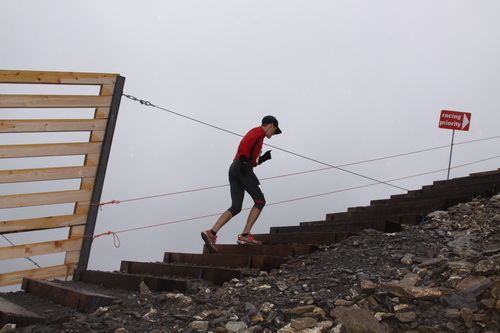 Welch ein Zieleinlauf: vom Gletscher aus ist noch ein Kilometer zu laufen. Die Strecke macht einen weiten Bogen dann geht es über eine steile Treppe nach oben. Die ersten Tritte sind so hoch, dass sich die auspumpten Läufer auf allen Vieren vorwärts bewegen. Von weitem erkenne ich jetzt Claudia Landolt. Irgendwie erscheint sie mir desorientiert. Sie läuft nicht in Richtung Treppe, sondern will auf der rutschigen Schotterpiste direkt nach oben. Aber das wird nichts.