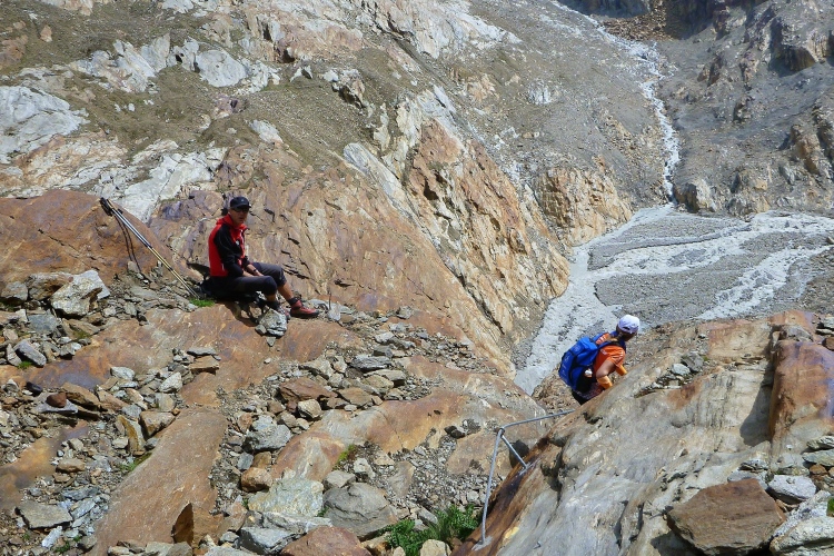 Gut, dass die Stahlkonstruktion nicht so stark schwingt. Am Ende wieder eine Leiter. Über blank gescheuerte Felsen, verschiedenfarbig marmoriert, geht es nach oben, im Hintergrund immer das „ewige“ Eis. Es ist unbeschreiblich schön. Ich denke darüber nach, ob die Erlebnisse in den Nationalparks der USA beeindruckender waren. Aber das ist 20 Jahre her. Im Moment bin ich nur glücklich über den Sonnenschein und die frischen Eindrücke. Kurze Zeit später ist die Brücke tief unter uns schon wieder ein schmaler Strich – und diese blöde Hütte immer noch einen Taleinschnitt entfernt. Die nächste aus dem Briefing bekannte Herausforderung nun live: 200 Meter müssen wir in das Langtal in die Tiefe. Wieder Tipps von drei Bergwacht-Männern. Der Weg ist ganz gut gesichert, aber unsere Beine haben ja schon einiges Auf und Ab hinter sich.