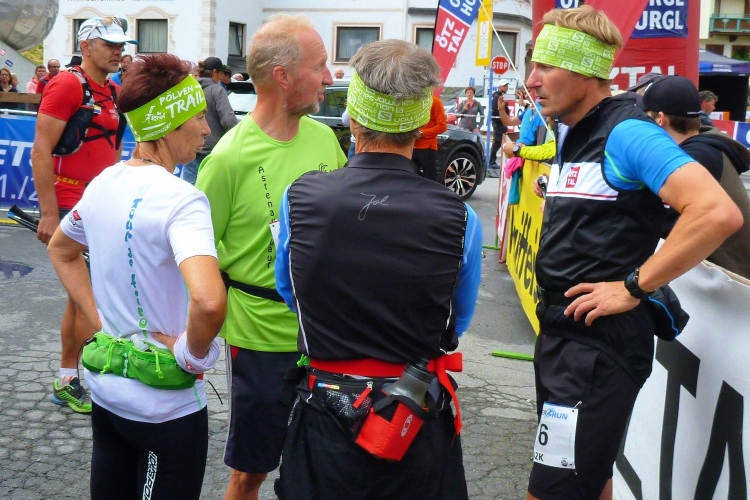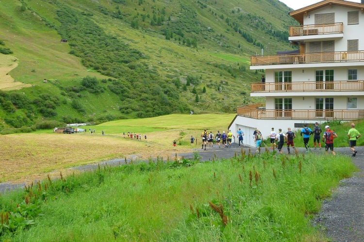 Wieder zurück ins Hotel und das Frühstücksbuffet genießen. Das Wetter soll vorerst stabil bleiben mit der Möglichkeit von Regenschauern am Nachmittag. Start für die Marathonis ist um 9:00 Uhr. Erstmals in unserem Läuferleben müssen wir heute die von der Austrian Trail Running Association (ATRA) vorgeschriebene Pflichtausrüstung mitführen. Schwer bepackt mit Wasservorräten, Regenjacke, warmer Kleidung und Erste-Hilfe-Set stellen wir fest, dass viele Läufer das wohl lockerer sehen. Ein Teilnehmer im grünen Shirt hat ganz auf Gepäck verzichtet. Leichtsinn? Immerhin werden wir heute bis auf 3.000 Meter Meereshöhe kommen. Wie wäre dort ein Gewitterschauer in T-Shirt und kurzer Hose zu überstehen? Auch verpflegungstechnisch ist das problematisch, da es nur ungefähr alle 10 Kilometer eine Labestation gibt. Und schon geht es los.