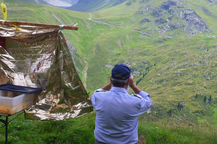 Dann taucht über uns am steilen Hang das Ramolhaus auf, eine Hütte der Sektion Hamburg im Deutschen Alpenverein. Es wurde 1881 bis 1883 erbaut und 1898, 1929 und 2005 erweitert. Ein großer rot-weißer Pfeil direkt daneben. Erst mit der Zeit erkenne ich, dass dies keine Werbung für das hier gebräuchliche Stiegl-Bier ist, sondern wohl eine Markierung für Hubschrauber. Einer von denen zieht über uns seine Kreise. Wir kommen also ins Fernsehen. Ich versuche professionell den Berg hinaufzurasen. Einmal bläst uns der Wind des Rotors fast um. So bei km 21 erwarten uns zwei Angehörige der Bergwacht. Hier beginnt die Begnungsstrecke zum Haus. 150 Höhenmeter, verteilt über einen Kilometer Länge, fehlen bis zum Haus. Die Luft ist dünn. Vor uns einige Trailrunner und Wanderer. Auf 3.002 Metern Seehöhe erwartet uns die Terrasse des Ramolhauses. Zeitnahme. Sonnenschein. Wunderbare Ausblicke auf die umgebenden Ferner.