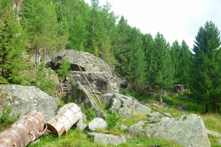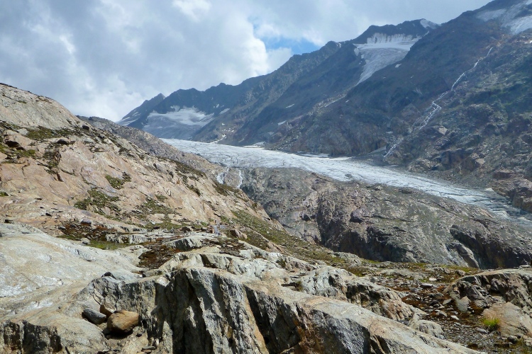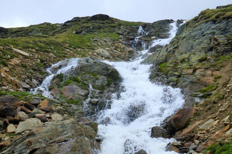Dann lustiges Trällern hinter uns. Fünf Vertreter der Bergwacht haben Feierabend und bleiben uns dicht auf den Fersen. Erst im Talgrund können wir sie laufend wieder abschütteln. Die nächste Brücke über den Abfluss des Langentaler-Ferners. Bis hier reichte früher der Gurgler Ferner und verschloss den Abfluss des Langentaler Ferners. Dadurch entstand ein bis zu 4 km² großer Eissee, dessen Entleerung im 18. Jahrhundert zu großen Sturmfluten im Ötztal führte. Hinter der Brücke wieder bergauf Richtung Hütte.