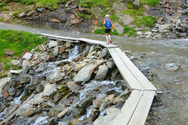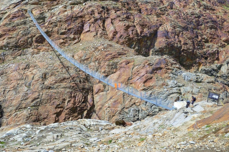 Ein Bergwachtler ermahnt uns, jetzt besonders aufmerksam zu sein. Blank gescheuerter Fels liegt vor uns. Noch vor wenigen Jahrzehnten verlief der Gurgler Ferner an dieser Stelle. Nun endet das Eis viele hundert Meter oberhalb. Ein neu angelegter Steig führt bergab, perfekt gebaut mit Drahtseil und großen Trittstufen. Auf einmal sieht man in der Tiefe ein kleines graues Band zur anderen Talseite. Dabei handelt es sich um die nagelneue, erst zur aktuellen Sommersaison in Betrieb genommene Hängebrücke, Piccard-Brücke genannt. Ein Läuferpärchen überquert sie gerade. Ich informiere einen Bergwachtler darüber, dass noch drei Mitstreiter nach uns kommen, und erfahre, dass diese aus dem Rennen genommen wurden. Schade, somit sind Judith und ich die Letzten. Aber jetzt erst einmal über die 142 m lange Brücke. 100 Meter unter uns tost das Schmelzwasser des Gletschers.