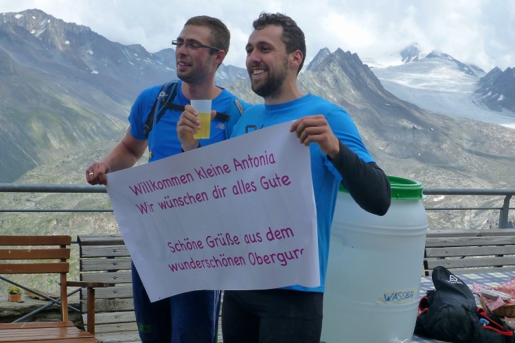 Kurz nach uns kommen zwei Läufer aus Berlin, sie entrollen ein Grußplakat für die kleine Antonia, die neu geborene Schwägerin des einen. Ich genieße noch einen Nutella-Keks und dann sind wir wieder unterwegs, 25 Minuten vor dem offiziellen Cut-off. Hinunter geht es recht einfach. Wir machen den drei letzten Läufern, die uns entgegenkommen, Mut. Die dürften noch ganz knapp im Zeitlimit bleiben.