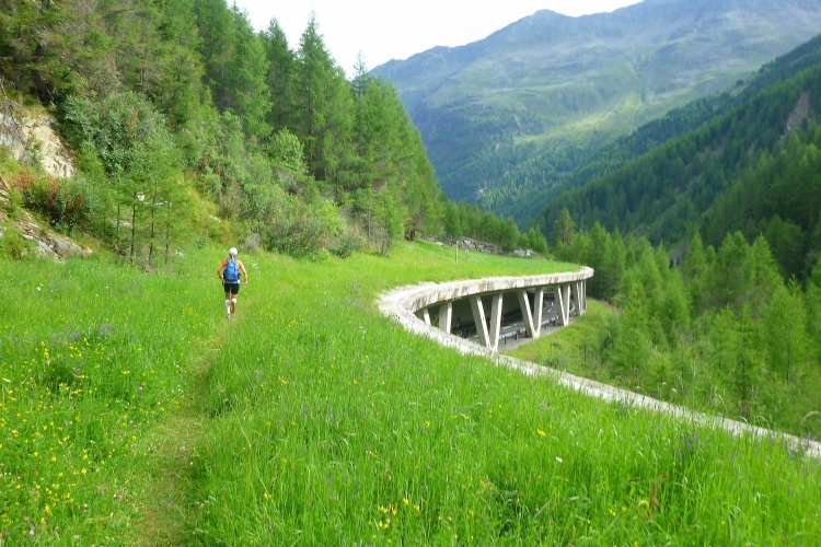Der Lauf ist als eine große, langgestreckte Runde um Obergurgl zu beschreiben. Für uns geht es zum Warmwerden vier Kilometer talwärts. Judith und ich befinden uns schon bald am Ende des übersichtlichen Feldes von gut 40 Startern. Meine Taktik ist das langsame Aufrollen von hinten. Bei Kilometer 4 geht es kurz auf die bestens gesicherte Straße, bevor wir auf der Lawinengalerie mit den Höhenmetern beginnen. Wir laufen durch schöne Nadelwälder Richtung Lenzenalm, die wir in der Ferne sehen, aber nicht erreichen. Am ersten VP geht es wieder zurück und ab jetzt knackig nach oben. Über 500 Höhenmeter liegen auf den nächsten drei Kilometern vor uns und wie geplant können Judith und ich hier stramm bergauf marschierend fünf Mitstreiter überholen. Auf der anderen Talseite liegt ein mit Holz verkleidetes Gebäude. Dort befinden sich das Motorradmuseum mit 230 historischen Exemplaren und die Mautstelle der Timmelsjochstraße: „Nur 8,5 km nach Italien“ verheißt ein Hinweisschild. In Südtirol ist der Pass kostenlos zu benutzen.