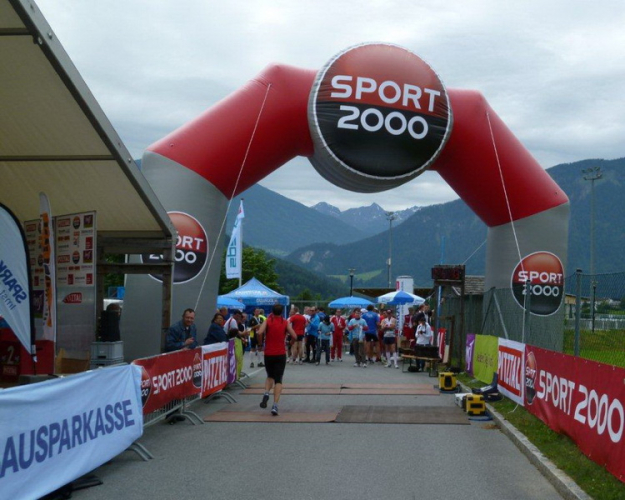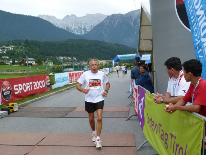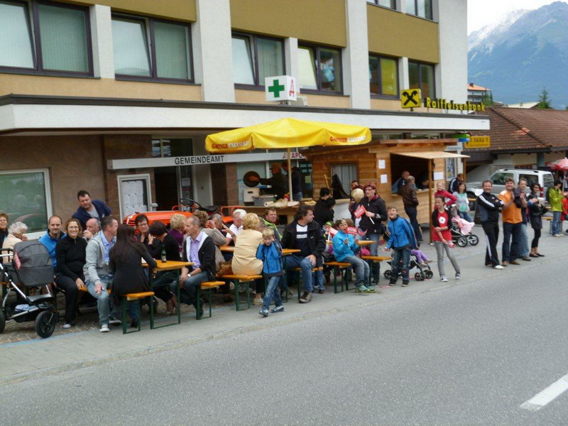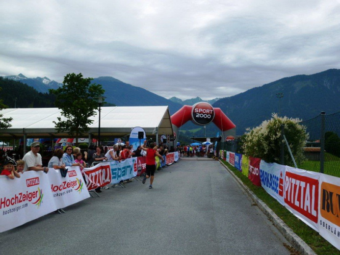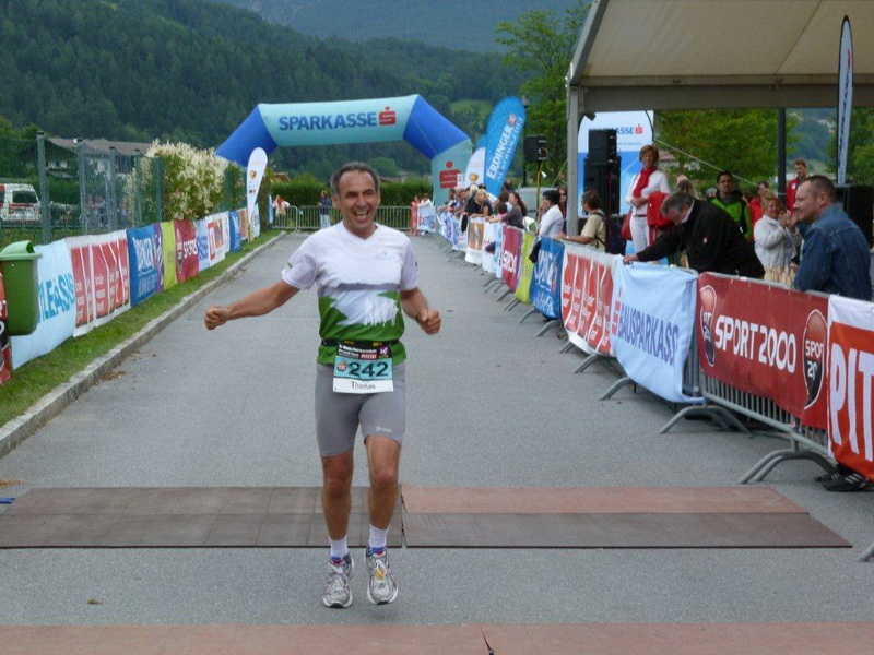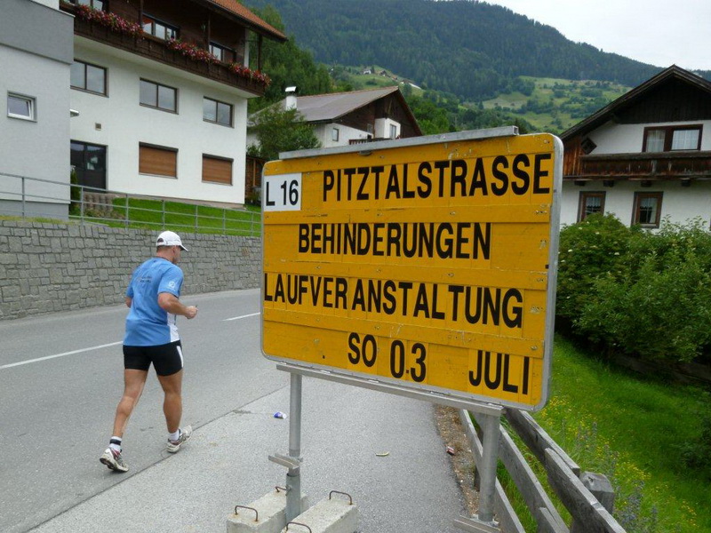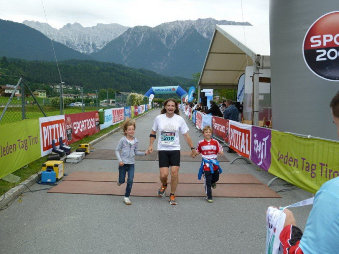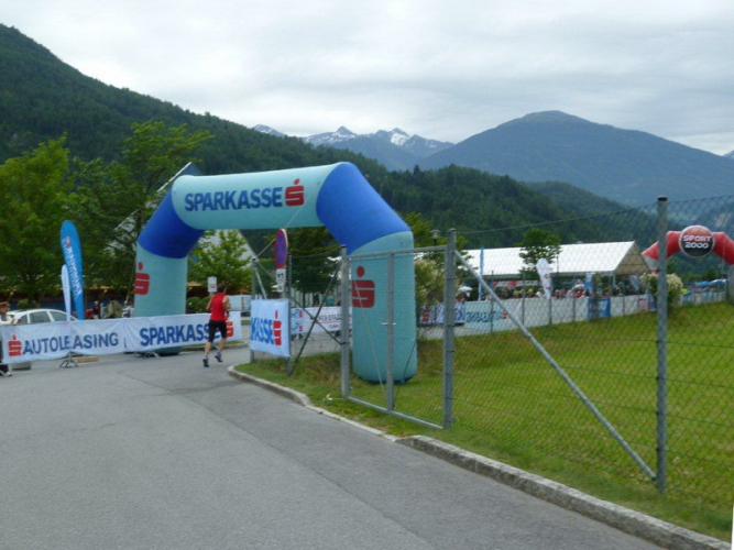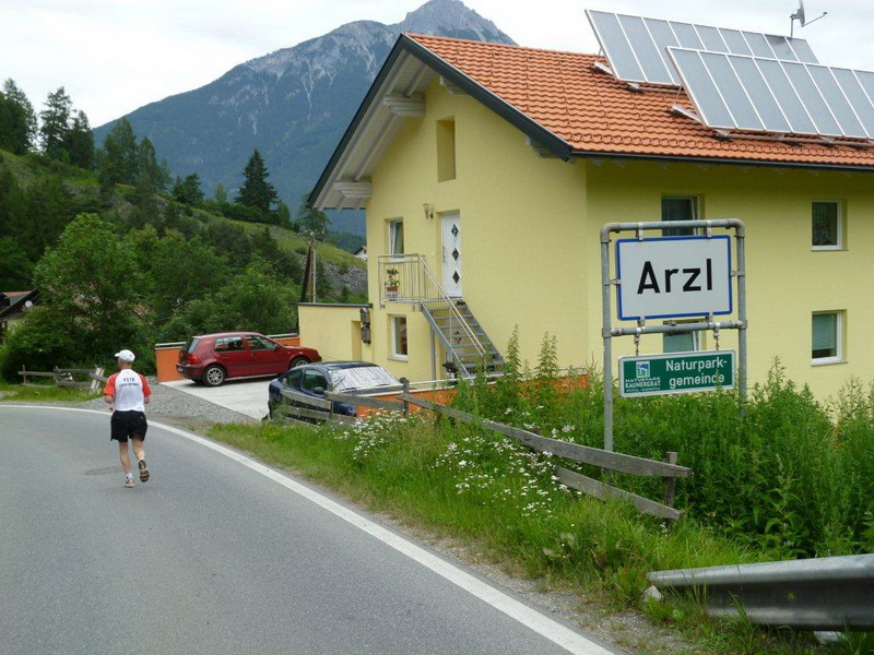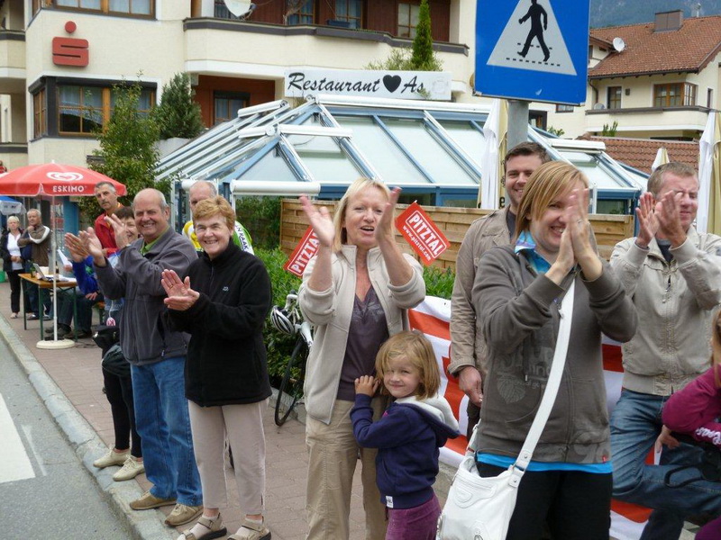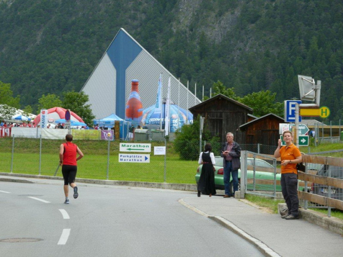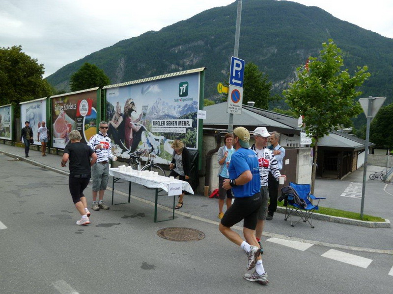 In der Ortschaft Arzl ist nicht nur reichlich Stimmung entlang der Straße, von hier aus geht es nochmals 150 Höhenmeter hinunter bis zur Brücke über den Inn. Bei Kilometer 38 höre ich das Geläut der Kirchenglocken und realisiere, dass ich bisher an keinem Kirchturm und auch sonst nirgends eine Uhrzeit wahrgenommen habe. Das Geläut wird wohl die Mittagszeit verkünden, ergo bin ich seit dreieinhalb Stunden unterwegs. Ich folgere daraus, dass eine Schlusszeit von unter vier Stunden möglich sein sollte, bin mir aber bewusst, dass es von Brennbichl bis zum Sportzentrum noch weitere drei Kilometer sind, welche gnadenlos aufzeigen, ob jemand noch ein paar Körner aufgehoben hat oder nicht.