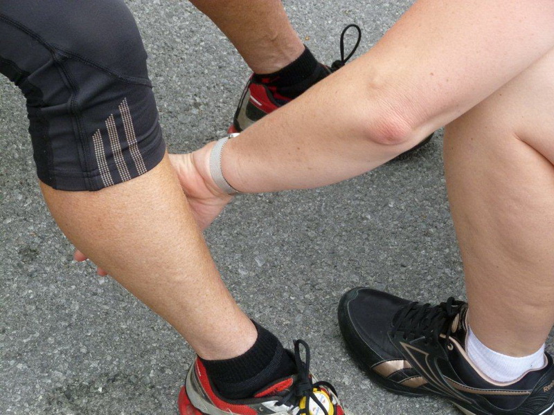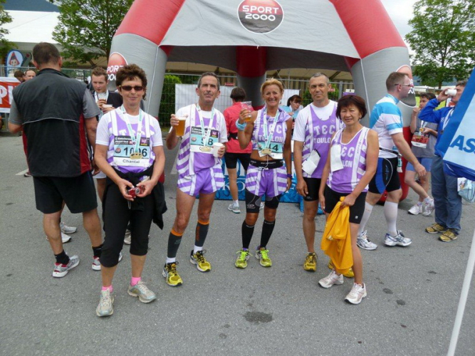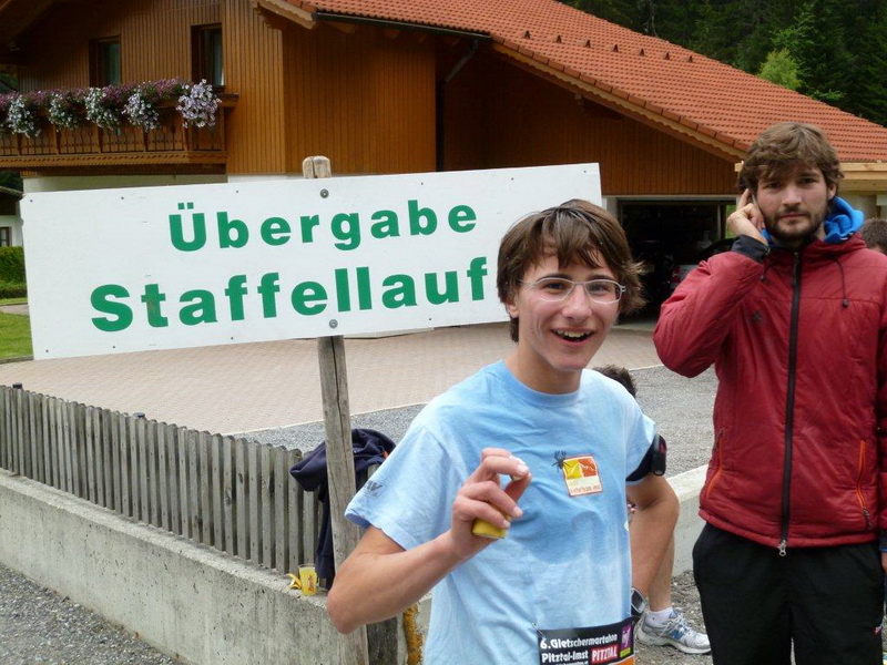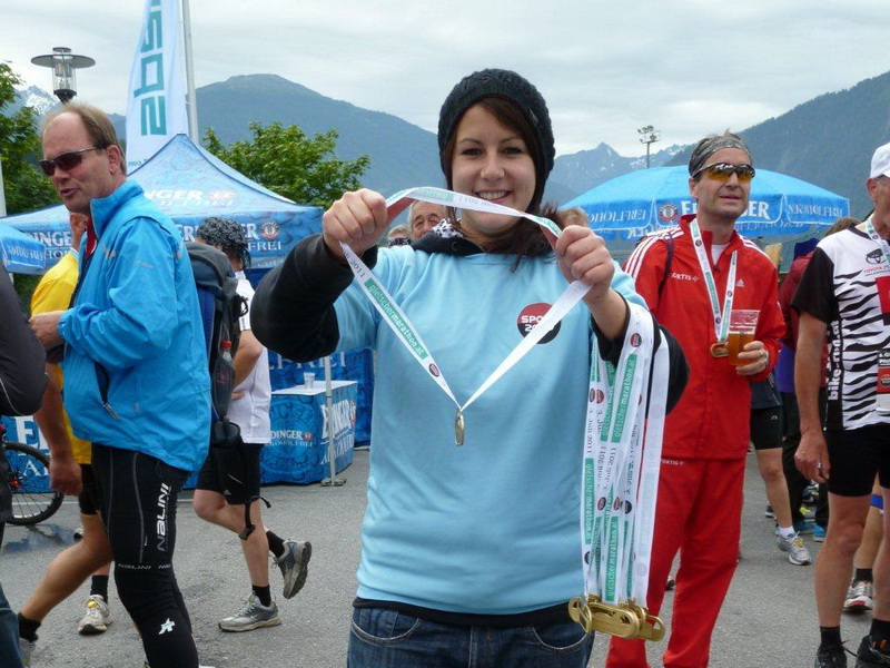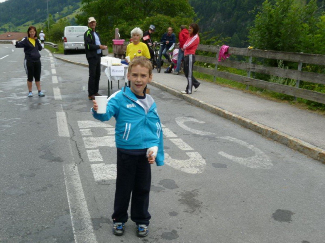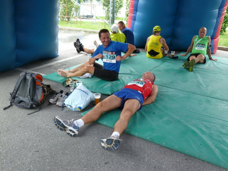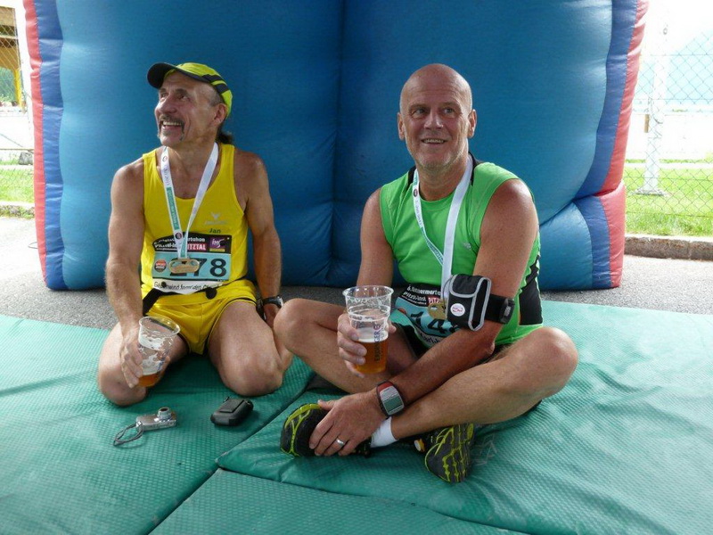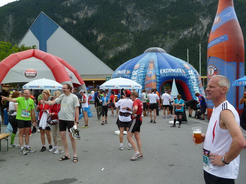 Beim Schwimmbad, kurz vor dem letzten kleinen Anstieg und der Schlaufe hin zum Zieleinlauf ist nochmals eine Wasserstelle. Heute geht es gut ohne, bei wärmerem Wetter wäre sie eine unverzichtbare Wohltat. Die nächste solche ist nach dem Zieleinlauf das kühle Bleifreie, welches mir alle anderen Angebote an Getränken, Früchten und Gebäck ersetzt. Die Nebenwirkung des Streckenprofils kann es aber auch nicht mildern: Die Oberschenkel geben mir zu verstehen, dass dieses Bergab-Training angebracht war und ich gestehe, dass ich die Treppe hinunter zur Gepäckausgabe und zu den Duschen einen ordentlich eckigen Gang einlege.
