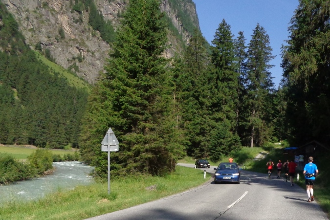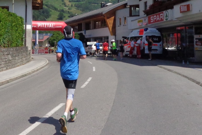 Bei km3 schließt sich die Startschlaufe, unter Beifall passieren wir das Startgelände. Die Zuseher beim Start können uns nun abermals anfeuern, Fotografen sind auch zur Stelle. Wenig später verlassen wir Mandarfen, gleich erreicht uns die Sonne, aber nur kurz. Dann werfen die hohen Berge zur Rechten wieder Schatten auf die Straße durchs Pitztal. Leichter Anstieg nach Tieflehn, es duftet nach frisch gemähtem Gras. Bei km5 in Plangeroß die erste Wasserstelle. Es läuft soweit ganz gut. Seit ein paar Tagen habe ich eine Bänderdehnung im rechten Fuß. Darum laufe ich heute mit alten Schuhen, die haben die richtige Passform. Eigentlich waren die schon ausrangiert, so kommen sie doch noch zu ihrem 20. Marathoneinsatz.