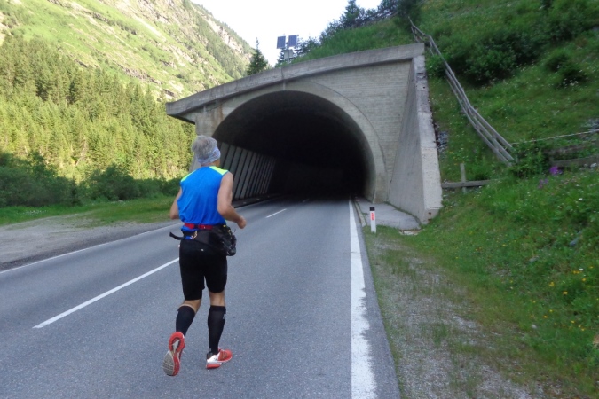 Heute laufe ich mit Trinkflasche in der Hand. Es ist ein gutes Gefühl, jederzeit trinken zu können. Vor Köfels der erste Tunnel, bei km8 schon der nächste. Die Berghänge links liegen bereits in der Sonne, die rechts im Schatten, malerische Wasserfälle auf beiden Seiten.