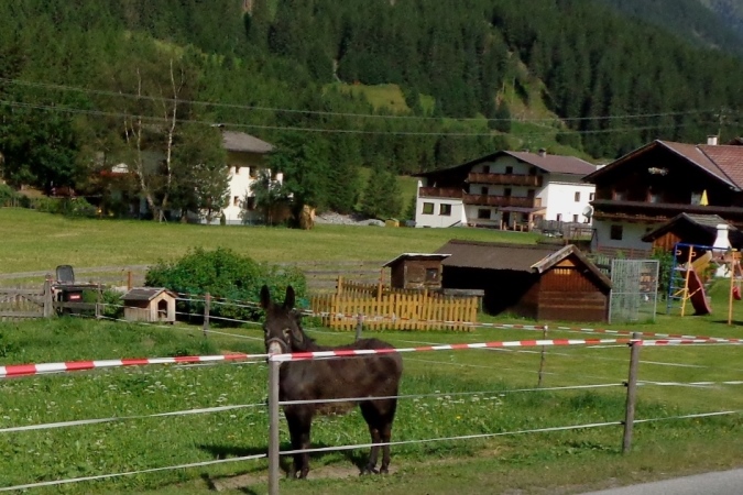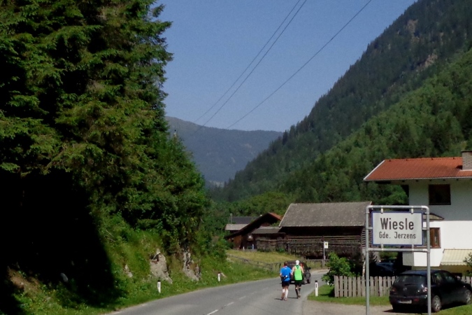 Es ist warm geworden, 2km bergab. Der Straßenverkehr ins Tal wird hier via Jerzens umgeleitet. Nicht alle sind einverstanden damit.