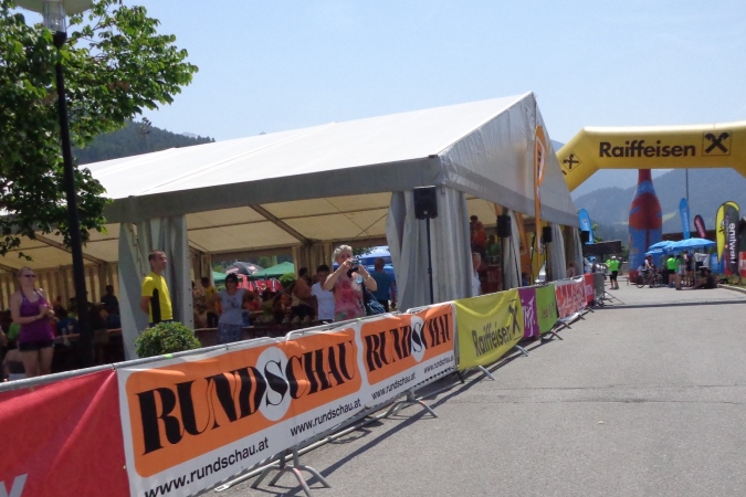 Der Halbmarathonstart war hier, deshalb gibt es einen Sprecher. Viele sind nicht da, die ihm zuhören, im Schatten kann man da und dort jemanden erkennen. Die Bierbänke in der Sonne sind leer, es ist noch nicht einmal 12h.