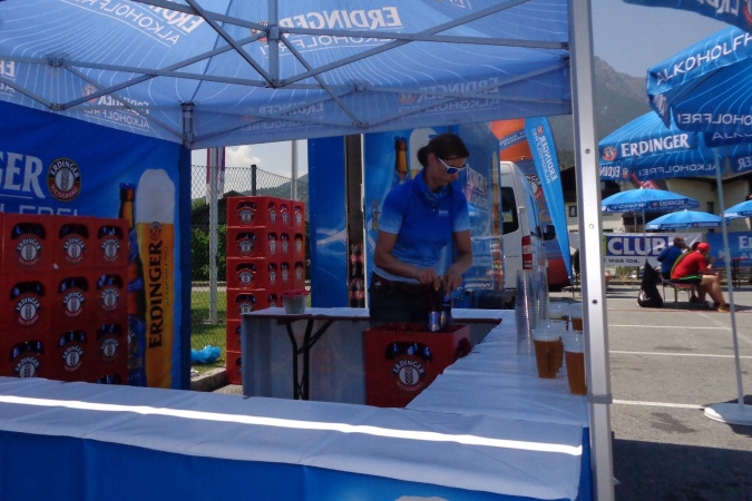 Ich schnappe mir einen Becher Erdinger Alkoholfrei und setze mich in den Schatten, wo ich auf Gerhard und Helene, AK-2. beim Halbmarathon, treffe.