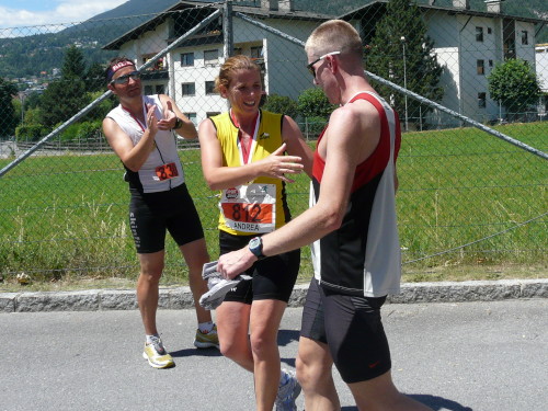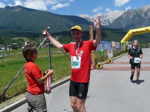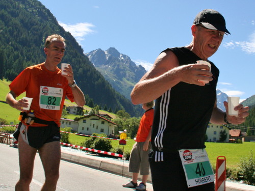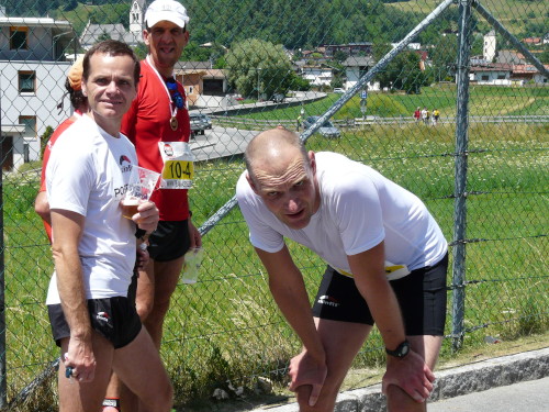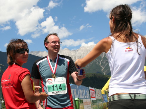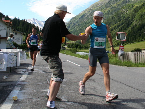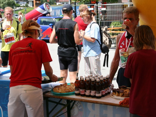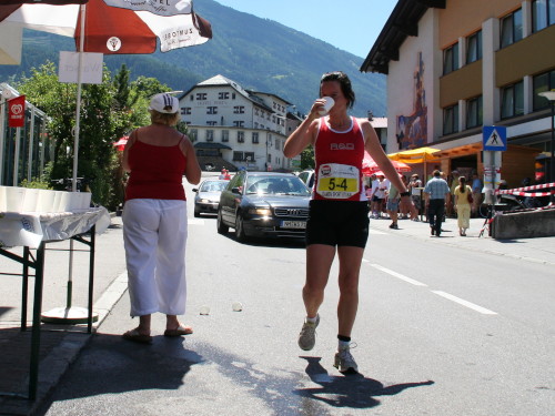 Es geht hinunter Richtung Imst. Der Verkehr hat deutlich zugenommen, ohne dass jedoch dadurch zu Problemen kommen würde. Polizei und Feuerwehr leisten gute Arbeit. Über die Innbrücke und den Kreisverkehr kommt man nach Brennbichl, wo es noch einmal Getränke gibt, diesmal auch Red Bull. Es gibt keine andere Möglichkeit, der Weg zum Ziel führt an öden Werkstätten und Fabrikhallen vorbei. Endlich ist man am Schwimmbad. Bevor man den Läufern den letzten Anstieg hinauf zum Sportzentrum zumutet, gibt es noch einmal Getränke und eine kalte Dusche.