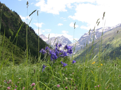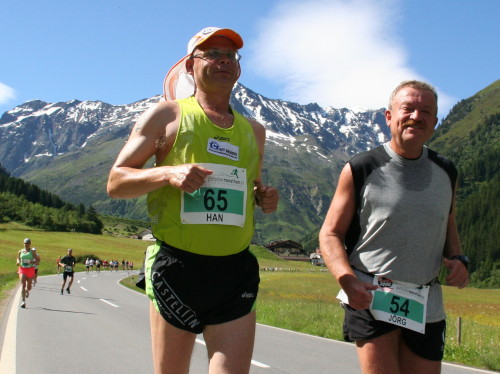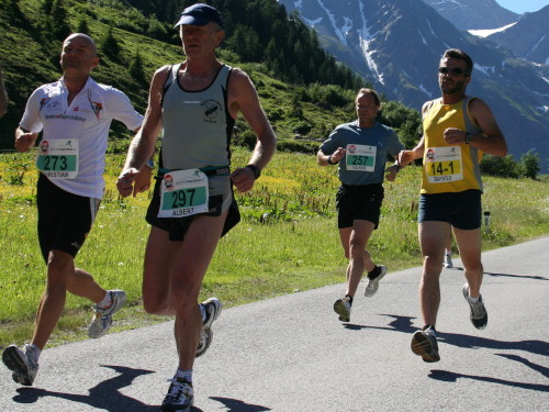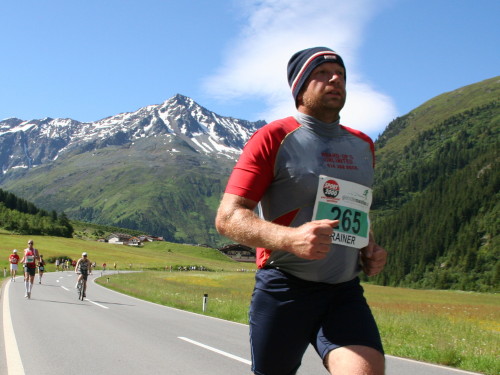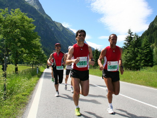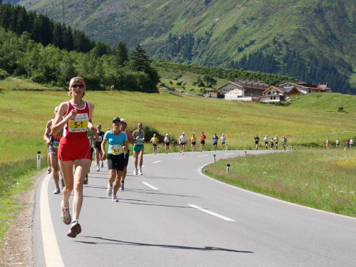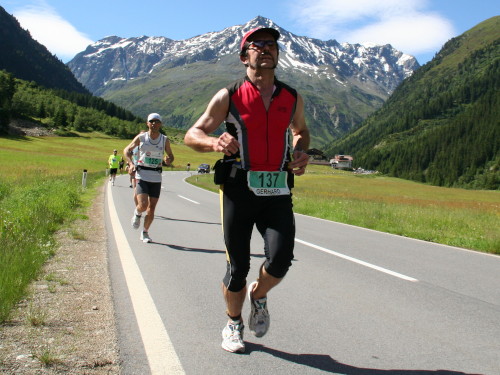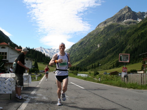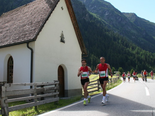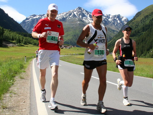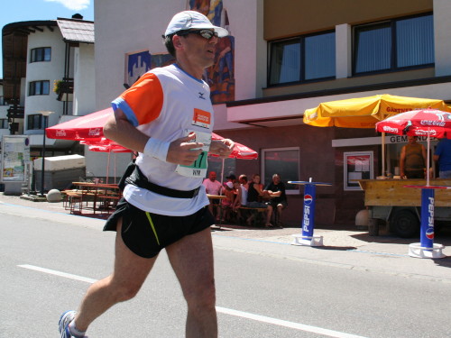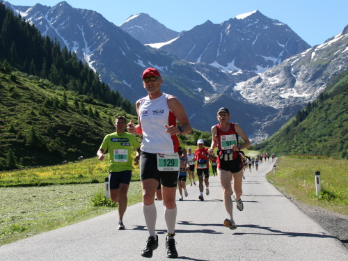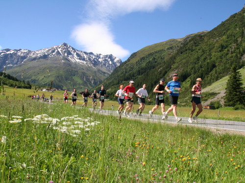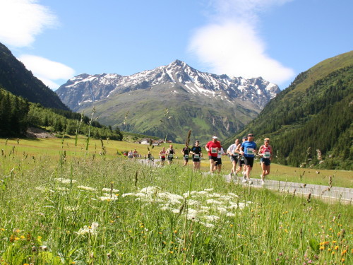 Dass man auf dem Parkplatz in Madarfen startet, ist neu. Bisher startete man weiter oben in Mittelberg. So ist es aber wesentlich besser. Man hat jetzt zwar gleich am Anfang einen kleinen Anstieg, aber angenehme Temperaturen und einen wunderschönen Blick auf die Pitztaler Berge, den Gletscher und auf gelbe, weiße und bunte Blumenwiesen, wie man sie nirgends schöner findet. Zwei Kilometer mögen es sein, dann ist man zurück in Mandarfen und rennt jetzt die Verkehrsstraße hinunter durch’s Pitztal. Die bis hierhin gelaufenen Kilometer werden in Imst eingespart, wo es bisher am Schluss in brütender Hitze durch’s Industriegebiet ging.