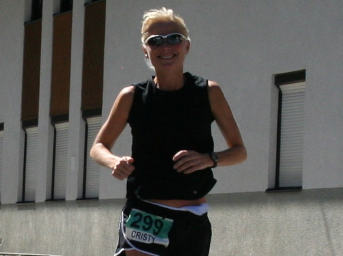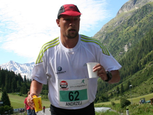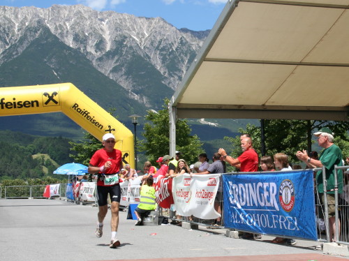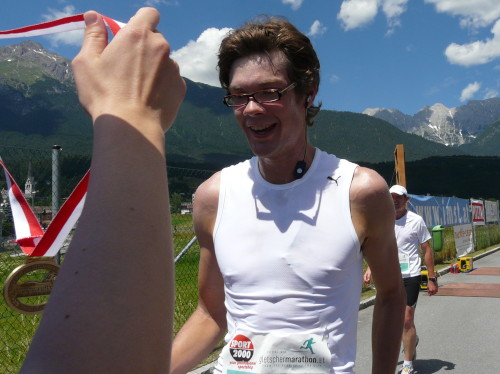 Der kleine Anstieg nach Arzl (880 m, km 36) mag den Marathonis wie ein Berg vorkommen. Kaum einen sehe ich laufen. Cola ist jetzt der Hit! Fast im1000-Meter-Takt kommen jetzt die Getränkestellen, private und offizielle wechseln sich ab. Kühles Nass aus Gartenschläuchen sorgt für kurzzeitige Erfrischung. Ich schwinge mich auf’s Rad und genieße den Fahrtwind. „Ich will nicht tauschen.“ Zum ersten Mal in meiner Verletzungszeit kommt mir dieser Gedanke.