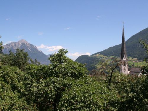 Abwärts geht es weiter. Links unten sieht man Kienberg und rechts geht hinauf nach Jerzenz (1.100 m). Das 1.000 Einwohner-Dorf hat über 2.000 Gästebetten, denn das Gebiet um Hochzeiger (2.560 m) und Wildgrat (2.971) ist bei Schifahrern sehr beliebt.