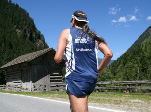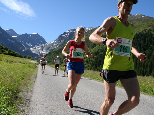 Gletschermarathon – hört sich an nach angenehmer Kühle, aber beschwerlicher Strecke. Ist aber nicht. Die Temperaturen sind nur am Morgen beim Start auf ungefähr 1700 m Höhe angenehm, später steigen sie auf über 30 Grad. Beschwerlich stimmt, obwohl die Strecke (fast) nur abwärts geht. Oder gerade deshalb? Aber sind 42 Kilometer nicht immer beschwerlich?