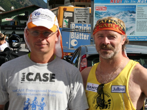 Dann sind wir in Mandarfen (1682). Was früher eine nur im Sommer bewirtschaftete Alm war, ist heute eine Hotelsiedlung mit fast 1000 Betten, Hauptsaison ist natürlich der Winter. Im Verkehrsamt kann man sich nachmelden, gegenüber gibt man seine Kleidertasche ab. Die Wartezeit vergeht im Flug. Schon richten zwei Schützen die auf einem Anhänger verstaute Kanone. Mit einem ohrenbetäubenden Knall wird der 3. Gletschermarathon gestartet.