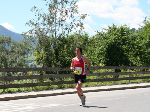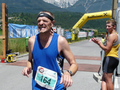 Wieder nach einer Brücke kommt die nächste Steigung. Es geht in der prallen Sonne hinauf nach Wenns (982 m). Kaum ein Läufer hat für den 2372 m hohen Tschirgant, dem Hausberg der Imster, einen Blick. Der Kampf beginnt. Von wegen „es geht ja nur bergab“. Jetzt rächt sich ein zu hohes Anfangstempo und vor allem die wenige Übung im Abwärtslaufen. Dazu kommt die Hitze …
