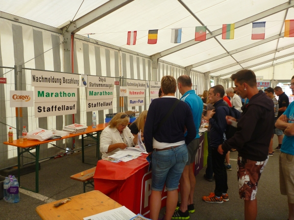 In Plangeroß kurz vor Km 5 gibt es die erste Verpflegungsstelle. Im Angebot ist hier nur Wasser. Später kommen Iso und zu essen Bananen und Melone dazu. Ich bin jedoch wieder autark dank meines Trinkrucksacks.