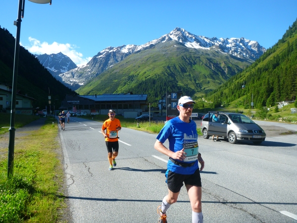 Die Straße als einziger Verbindungsweg durchs Pitztal ist nicht gesperrt. Immer wieder fahren Autos und Busse an uns vorbei. Aber keiner tut dem anderen was. Wir Läufer halten uns schön rechts auf der Straße und die Autos passieren uns vorsichtig in gedrosseltem Tempo. Geht doch! Wäre z. B. in Italien so nicht machbar, denke ich mir.
