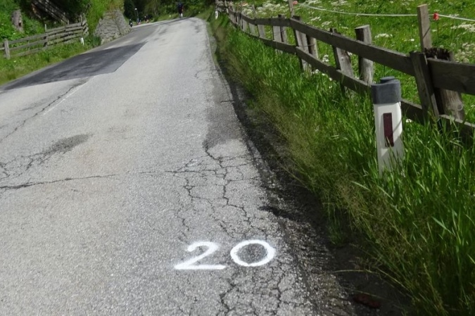 Ich schließe zu Helena auf, Marion ist hingegen enteilt. Auf dem nun folgenden Abschnitt hinunter nach Arzl, mit rund 3000 Einwohnern eine der größeren Gemeinden im Pitztal, kann ich Tempo zulegen. Der Platzsprecher kündigt mich beim Durchlauf an: „Dös isch da Anton aus Wian, niet von Tirol…“ „Stimmt nicht“, schrei ich ihm zu, „i bin in Lienz geborn, dos du esch woascht“. Endlich gibt es Cola, bisher das erste Mal. Vielen Dank an die netten Bewohner von Arzl, die zu Dutzenden vor einem Gasthaus auf Holzbänken in der Sonne hocken, sich ein Bier genehmigen und applaudieren.