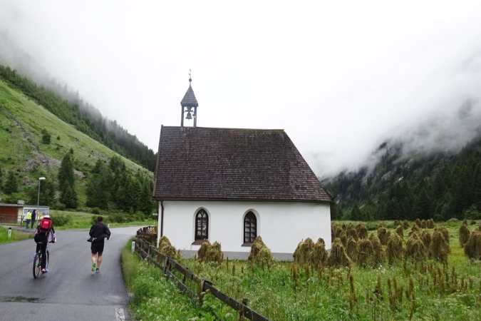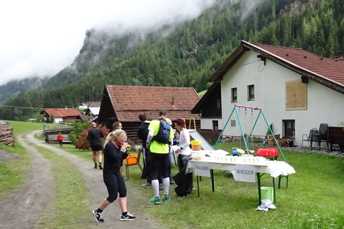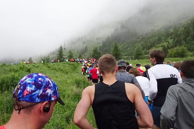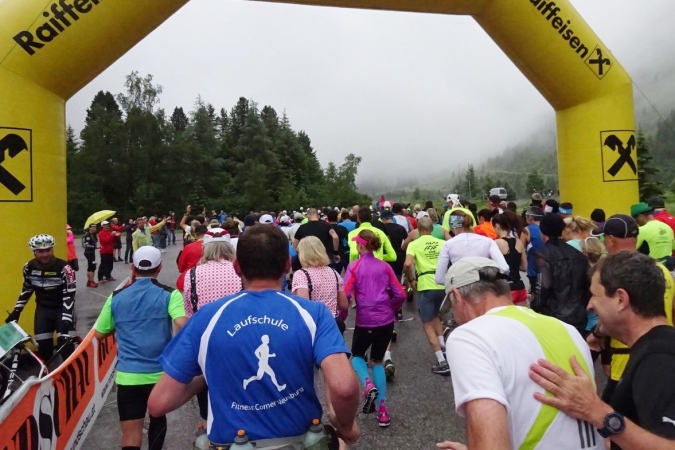 Je näher wir zum Startort kommen, desto mehr verschlechtert sich das Wetter. Gestern in St. Anton hatten wir herrliches Sommerwetter, hier in Mandarfen regnet es heute um 7 Uhr morgens. Nebel zieht auf, es hat nur 8 Grad C. Eine Läuferin in Shorties klagt über die unerwartete Kälte, Gänsehaut überzieht ihre Beine. Ich ziehe mir schnell ein Singlet unter dem Kurzarmshirt an, als dritte Lage noch die Windjacke.