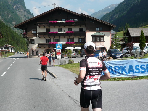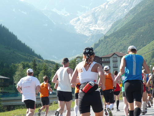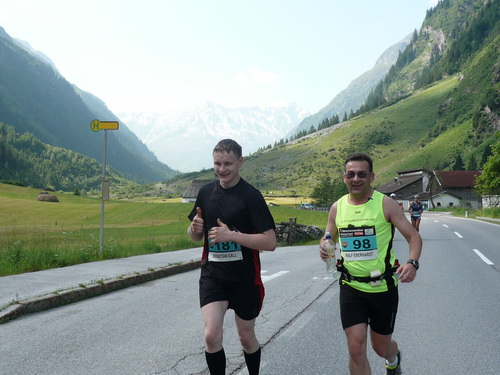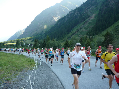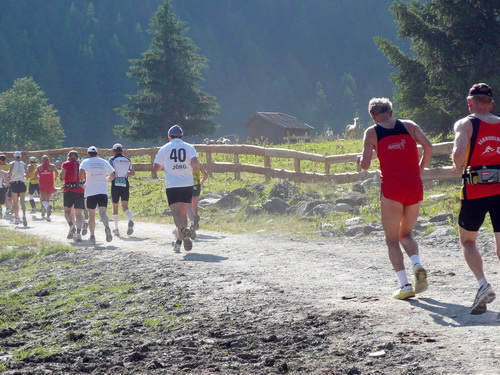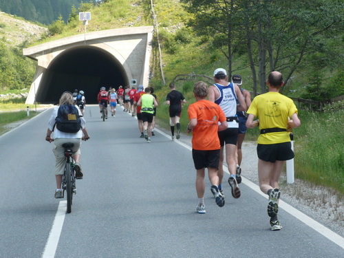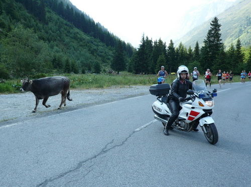 Im ersten Moment schaut es lustig aus, als zwei Kühe sich im Läuferfeld verirren und mitgaloppieren. Die Milch wird wahrscheinlich dann zur Butter. Ein Polizeimotorrad hat Mühe, die Kühe mit Gehupe vom Feld zu trennen. Wir müssen aufpassen, nicht dass die Rindviecher einen Teilnehmer übern Haufen rennen. Etwa einen Kilometer lang dauert die brenzlige Situation.