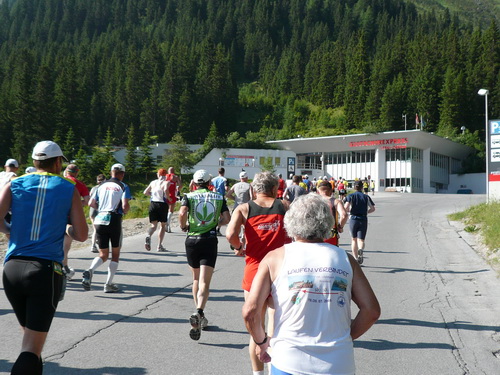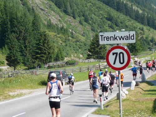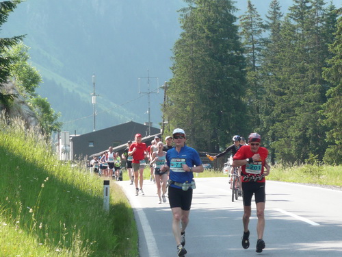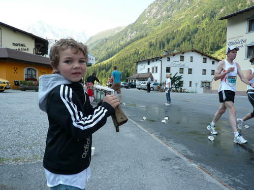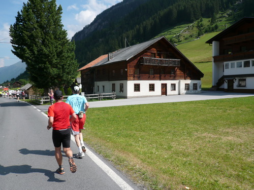 Bei Kilometer fünf in Plangeroß (1617 Meter) können wir an der ersten Wasserstelle bereits zugreifen. Wasser wird heute ein wichtiges Versorgungsgut werden. Wir finden etwa bis Kilometer 30 alle vier, fünf Kilometer die Trinkstellen mit Wasser und Iso, teilweise auch mit Obst. Später wird auch Cola und Red Bull gereicht. Zum Ende hin ist auch der Abstand deutlich geringer.