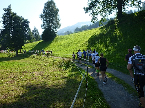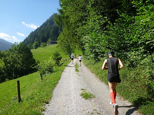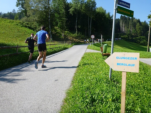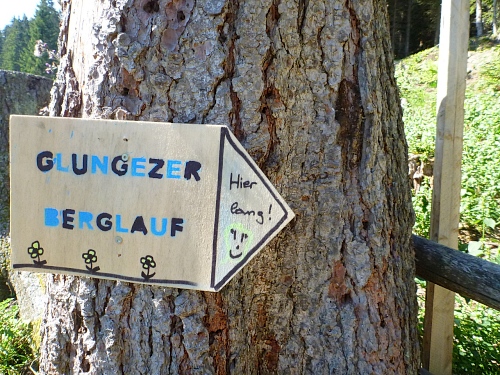 inteilen lässt sich die Strecke in zwei Teile: Die erste Hälfte, knapp zehn Kilometer mit rund 1000 Höhenmeter, lässt sich fast ausschließlich belaufen, während es auf dem zweiten Teil so richtig zur Sache geht. Knapp fünf Kilometer mit nochmals gut 1000 Höhenmeter bis zum Gipfel des „Glungi“, wie die Einheimischen zu ihrem Hausberg sagen.
