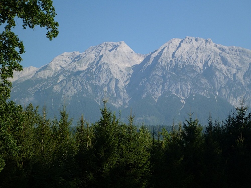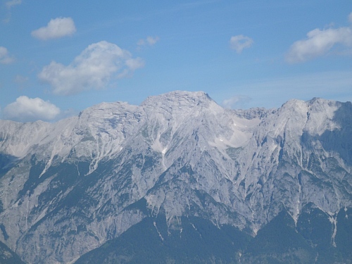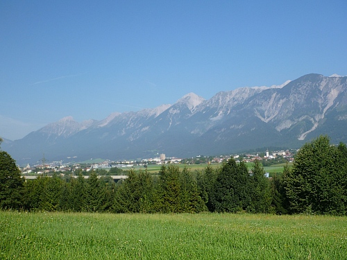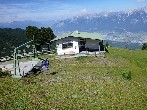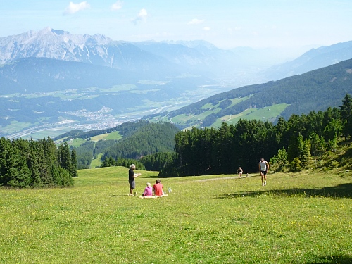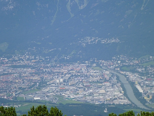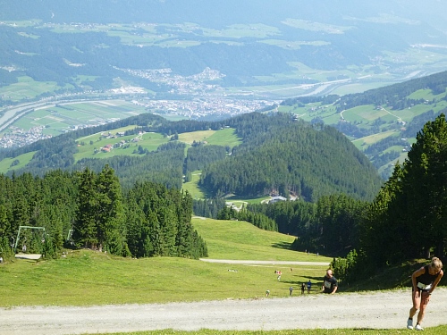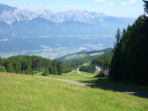 Bei jedem Umdrehen wird die Aussicht immer grandioser und spektakulärer auf die Nordkette und das Karwendelgebirge. Tief unten ist das Inntal zu erkennen. Der Blick nach Nordwest fällt auf die Landeshauptstadt Innsbruck. Der zehnte Kilometer ist kurz vor der Bergstation Tulfein.