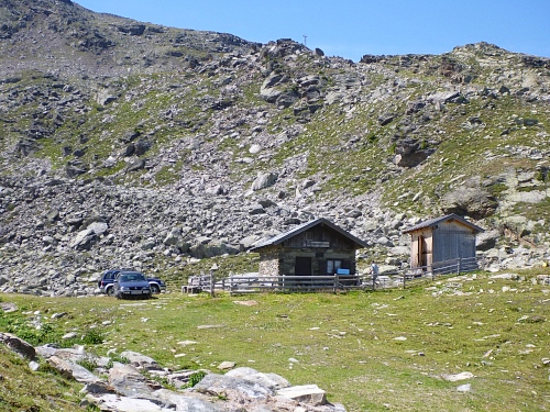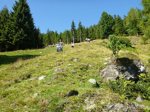 Mittlerweile ist linkerhand tief unten im Talgrund das Rauschen des Volderbaches zu hören. Kurzzeitig laufen wir wieder auf einem kurzen Schotterstück, bis uns eine über den Weg gelegte Holzstange nach links weist. Und da geht es einige Höhenmeter im Kriechgang weglos hoch zur Stiftsalm (1337 Meter).