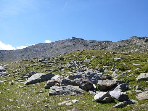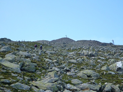 Einen Wanderer frage ich nach dem Gipfel und der deutet auf das einige Zeit zu sehende Gipfelkreuz hin. Ist gar nicht so weit mehr weg, aber die Dimensionen sind am Berg etwas anderes, wo du für einen Kilometer Laufstrecke 15 bis 20 Minuten brauchst. So ist es auch hier.