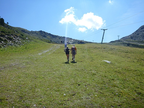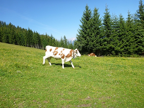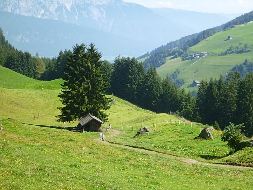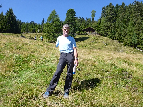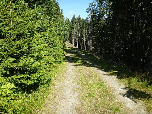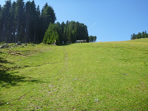 Wie verlassen kurz nachher den Fahrweg nach rechts auf einen schmalen Wanderweg durch den Wald. Farnkräuter reichen bis in den Weg, fast idyllisch, wenn nicht die Schnauferei wäre. Kurz danach geht es wieder über Almwiesen, weicher Grasboden, eine Wohltat für die Füße.