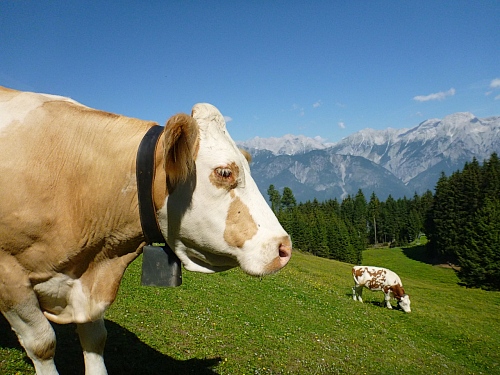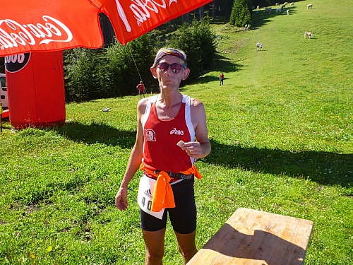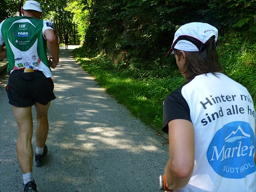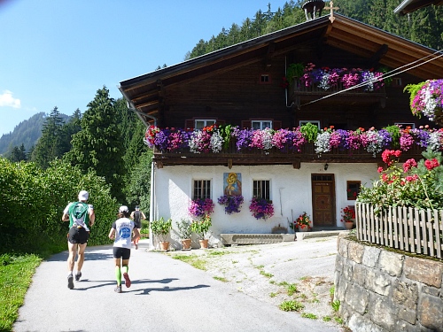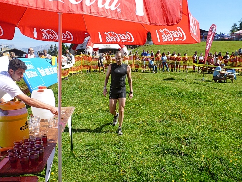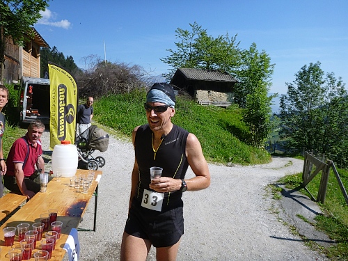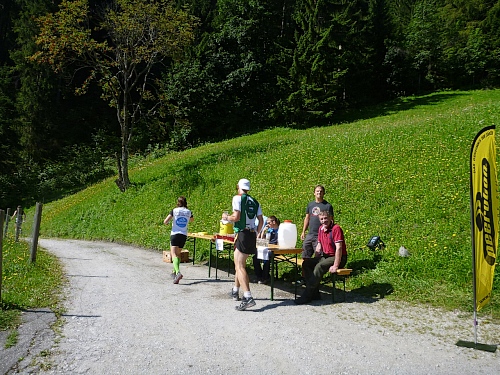 Kilometer 5,1, die erste von vier Verpflegungsstellen auf der Strecke, ist erreicht. Schnell ein Stück Banane und einen Becher mit Iso einverleibt und ich mache mich weiter auf den Weg. Zuschauer sind natürlich fast an einer Hand auf der Strecke zu zählen. An den Almen stehen halt die Senner und Helfer, beobachten und feuern uns an.