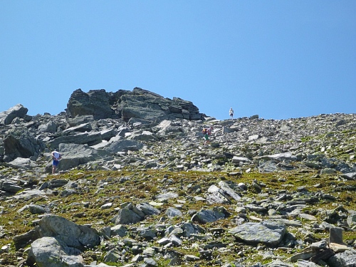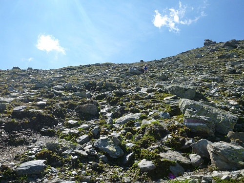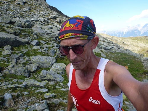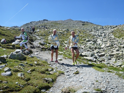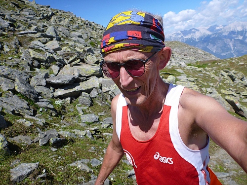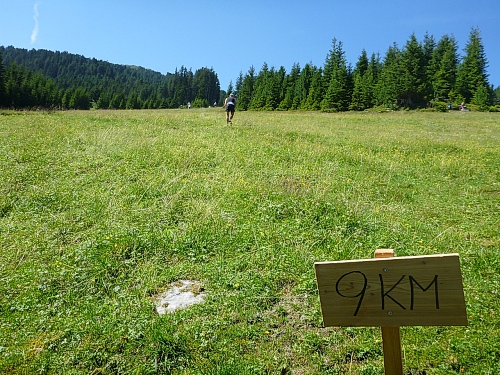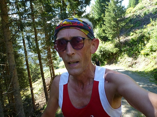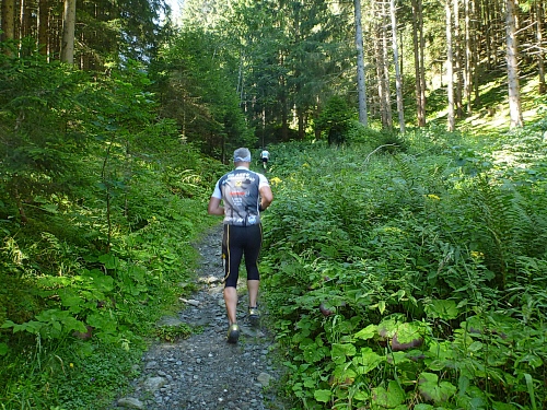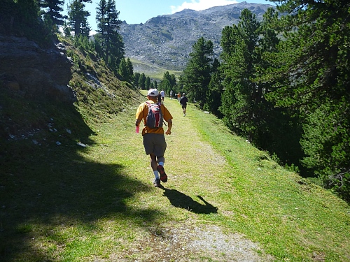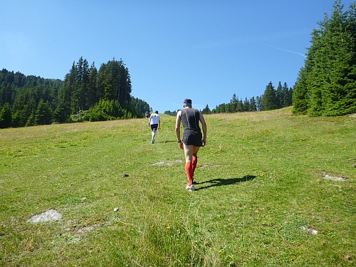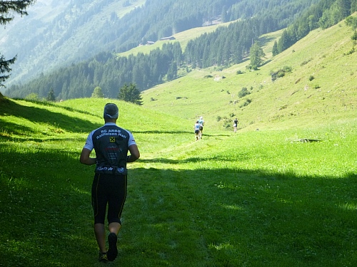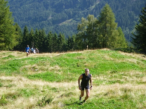 Doch jetzt ist Schluss mit lustig, denn es folgt der Abschnitt entlang der Skipiste. Weglos, zwar nicht mehr ganz so steil wie vorhin, doch zum Laufen ist es eindeutig zu hart. Ich sehe keinen am Joggen. Die Läufer haben sich ewig weit auseinandergezogen. Zwar kommen von hinten ein, zwei Gegner, die am Berg geländegängiger als ich sind, doch ich kann auch ein bis zwei überholen. Das hält sich somit die Waage.