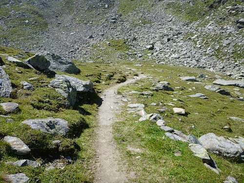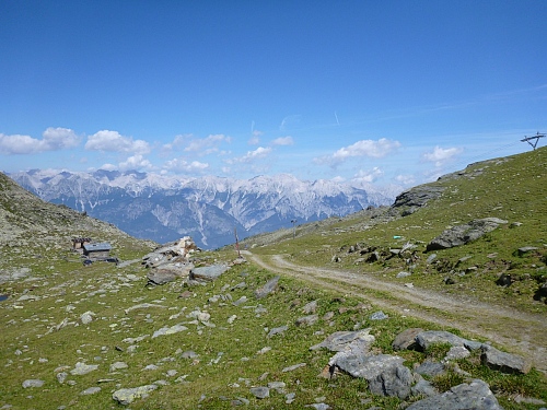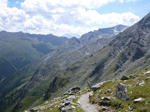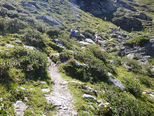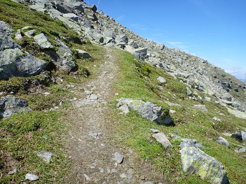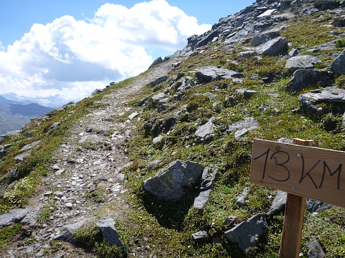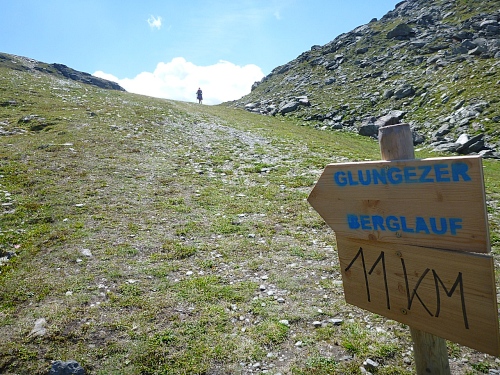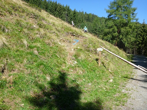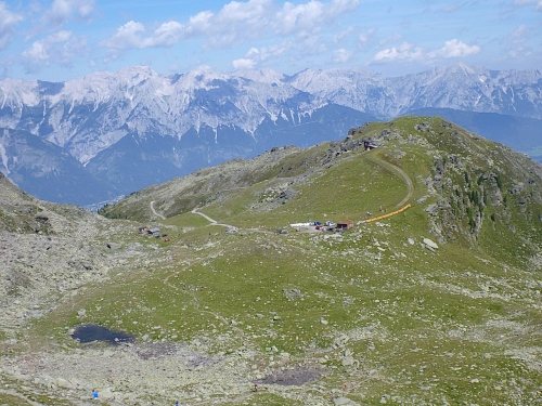Es lassen sich wieder einige Meter laufen, bis mich die Skipiste am Kalten-Kuchl-Lift wieder zum Bergwanderer werden lässt. Am Tulfeinjöchl auf 2278 Meter Höhe gibt es nochmals Gelegenheit zur Labe. Dann wartet das letzte Stück auf einem Steig. Der ist zwar nicht gefährlich, doch wollen die Schritte gewählt sein. Wer genug Luft und Kraft hat, der kann noch die Abkürzer nehmen. Wem es da mangelt, der läuft, äähhh geht die Serpentinen. Und verliert auch keine Zeit. Denn nämlich mein Verfolger kommt trotz meiner Foto- und Verschnaufpausen auch nicht effektiv näher.