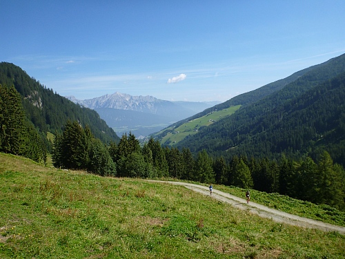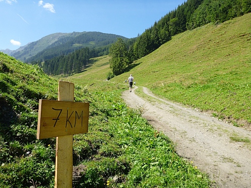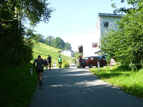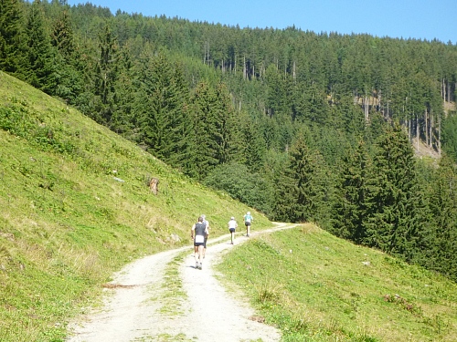 Nach ein paar Metern auf einem gekiesten Almweg schwenken wir auf die asphaltierte Kleinvolderbergstraße ein, die uns in Serpentinen schon eine Menge Höhenmeter belaufen lässt. Kurz vor Kilometer fünf endet die Teertrasse, es läuft sich auf befestigen Untergrund gefällig weiter.