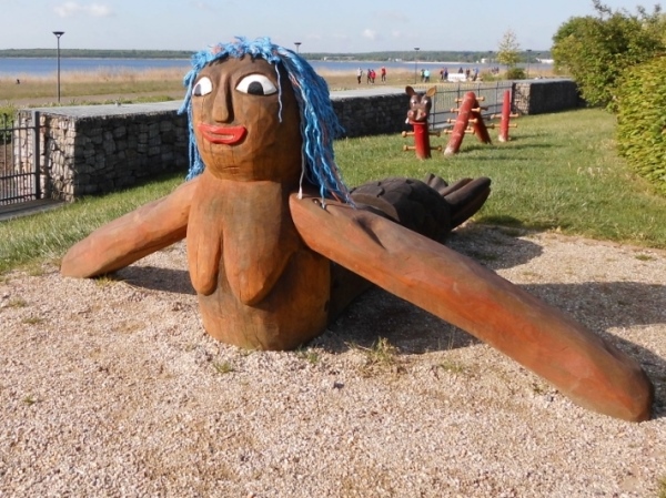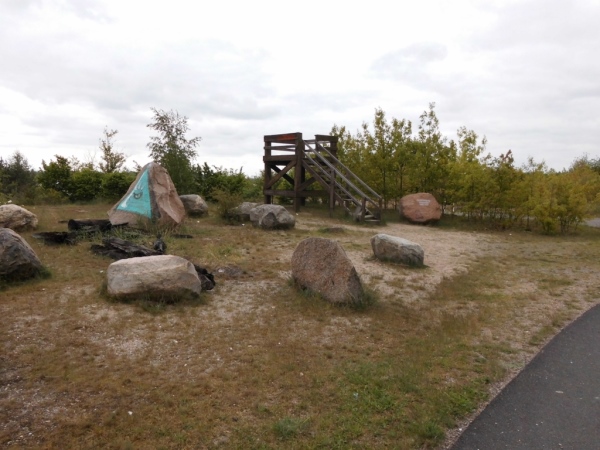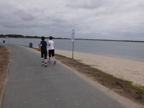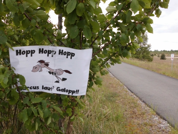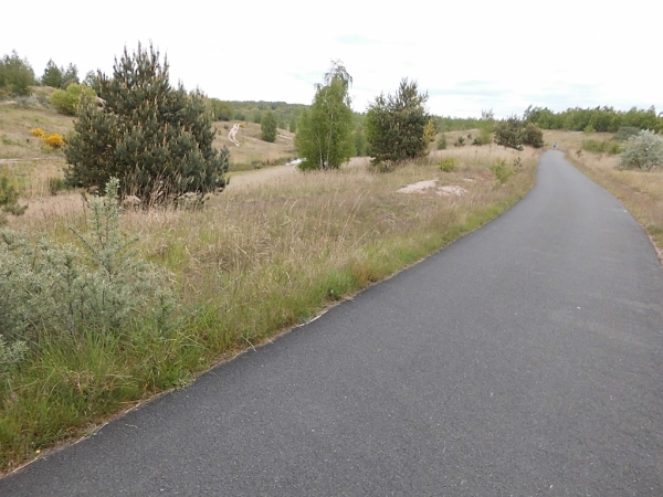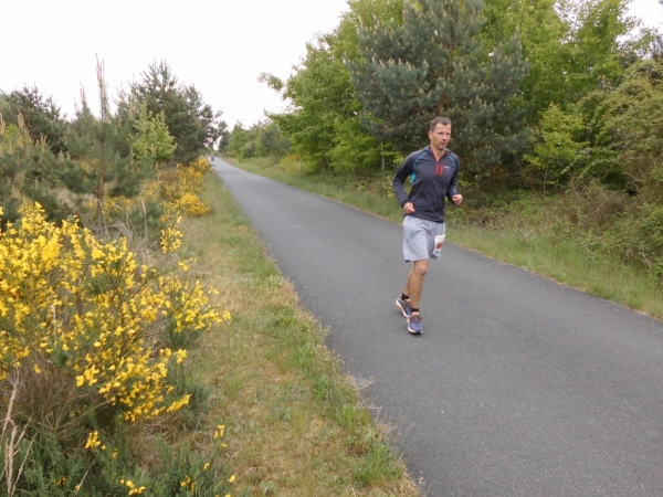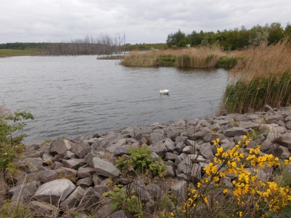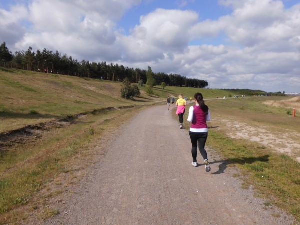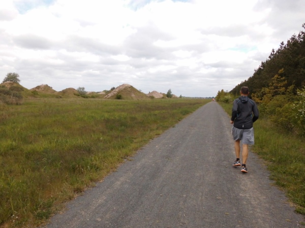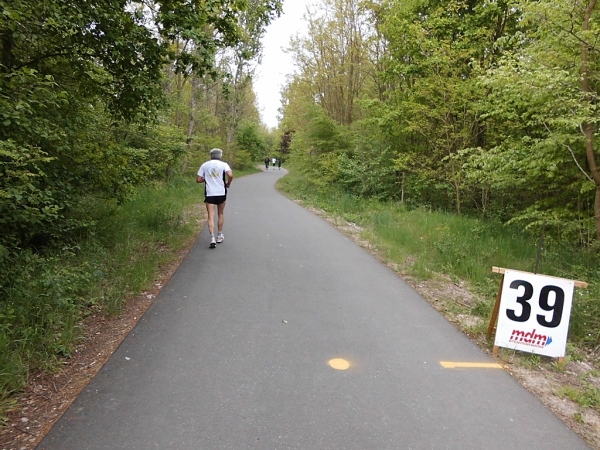 Einen großen Teil der Strecke laufen wir durch eine Landschaft, die mal ein Wald werden will. Fast immer auf Asphalt. Es gibt einige Hügel, es lohnt sich aber nicht darüber zu schreiben, dafür sind sie zu klein. Wir passieren kleine Seen, sogar einen Schwan haben sie für uns Läufer darauf angesiedelt. Oder ist der immer dort…?