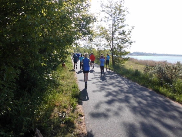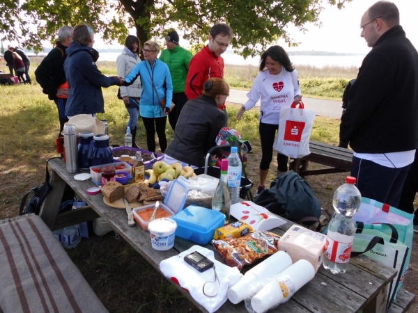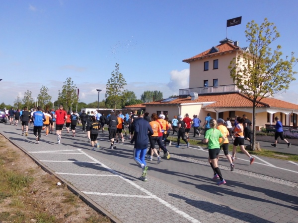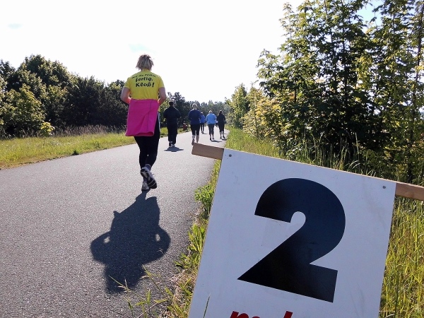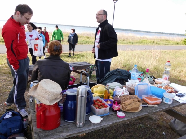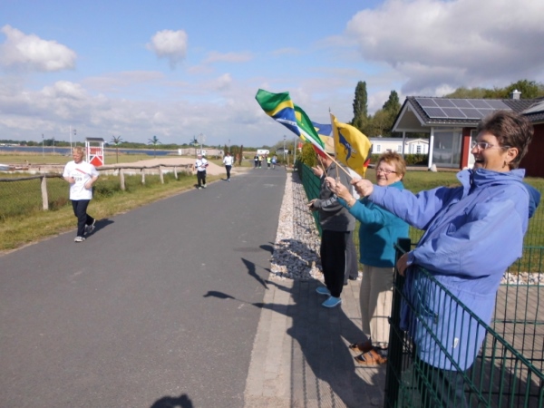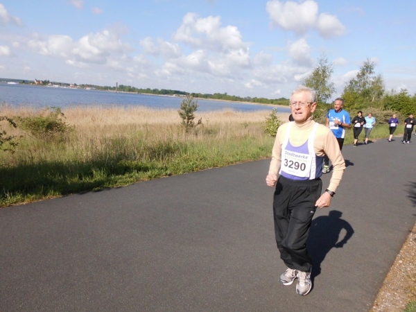 Etwa bei Kilometer 25 befinde ich mich auf einem langgezogenen Weg und schaue mich immer wieder um. Nicht nach der Nummer 66 – der ist vor mir. Aber auf diesem Streckenabschnitt hatte uns im vergangenen Jahr Falk Cierpinski überholt, der spätere Sieger des Bernsteinlaufs über 24,5 Kilometer. Heute bleibt es hinter mir leer. Bin ich so schnell, oder sind die um 11 Uhr gestarteten Bernsteinläufer so langsam?
